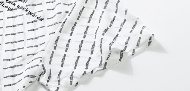 ホワイトカラーの半袖シャツで、柄入りのデザインがおしゃれ。110cmから180cmまでの幅広いサイズ展開で、男の子も女の子も着用可能。シンプルで使いやすいアイテムながら、白をベースとした柄が個性的。ヒップホップダンスやストリートファッションとして人気で、清潔感のあるホワイトカラーがコーディネートしやすく、ダンスレッスンから普段着まで幅広く活躍するトップスです。