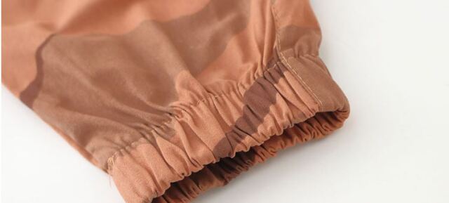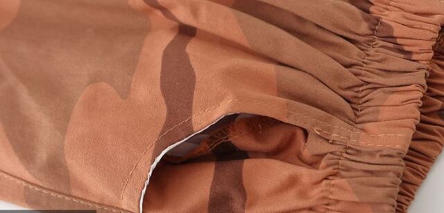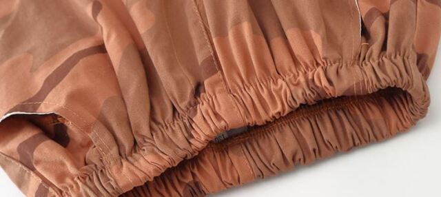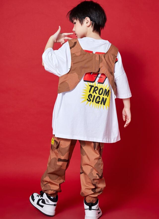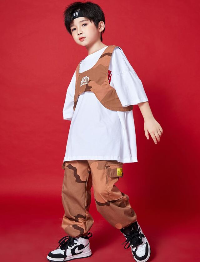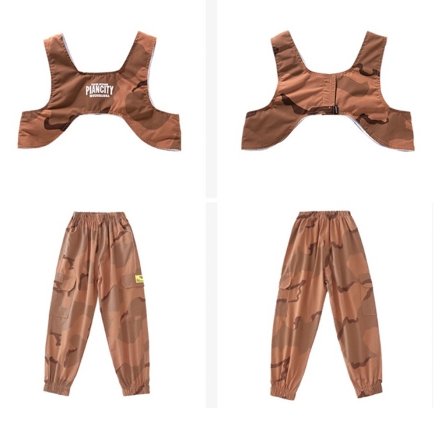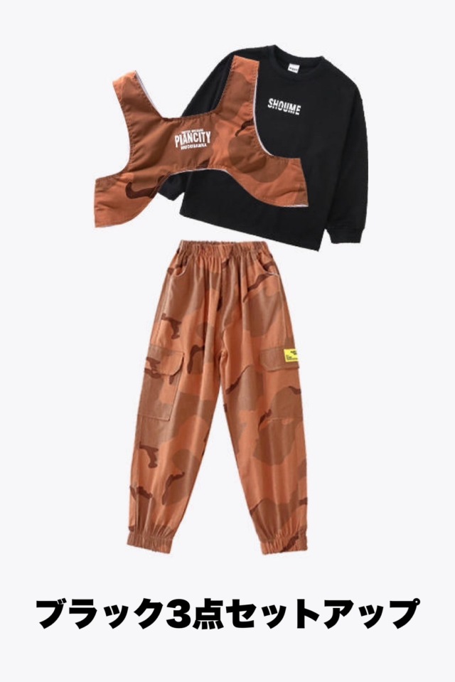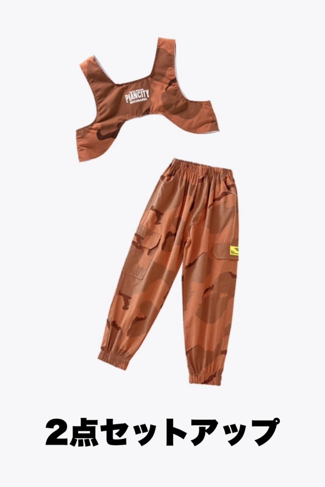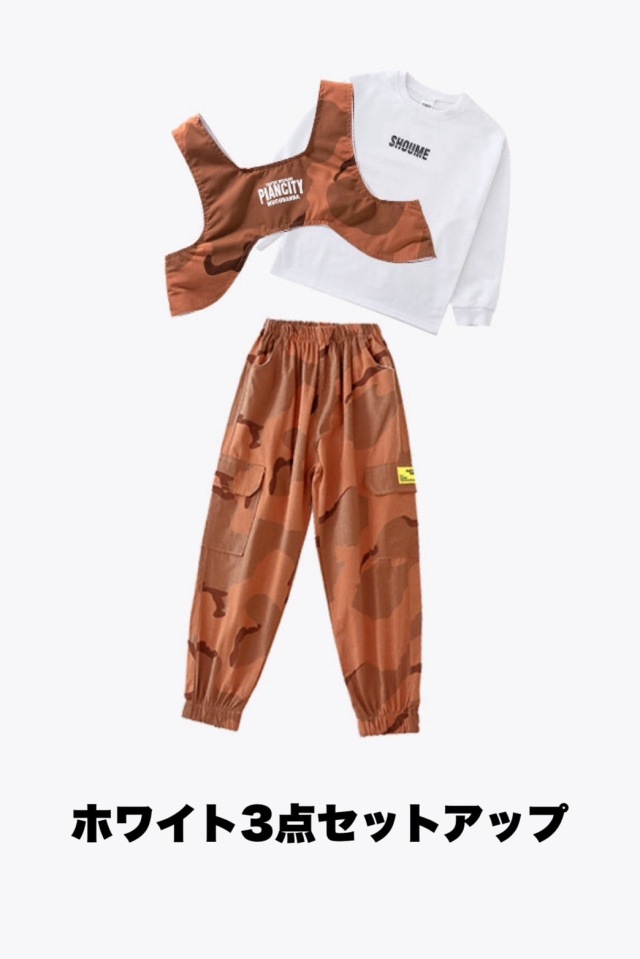 迷彩柄のセットアップで、ホワイト3点セット、ブラック3点セット、2点セットアップから選べます。ベスト、ロングTシャツ、パンツの組み合わせで、ブラウンの茶色系カモフラージュデザイン。110cmから180cmまでの幅広いサイズ展開で、男女兼用。ノースリーブのベストが個性的で、ヒップホップダンスやストリートファッションとして人気。迷彩柄がかっこよく、レッスンから普段着まで活躍します。