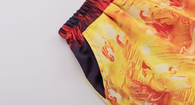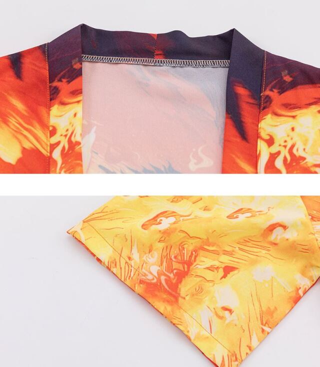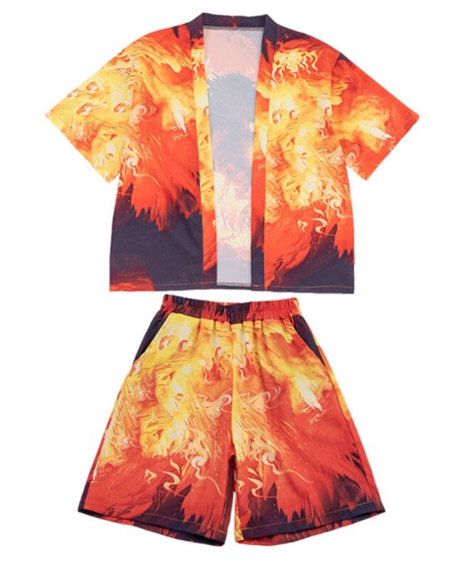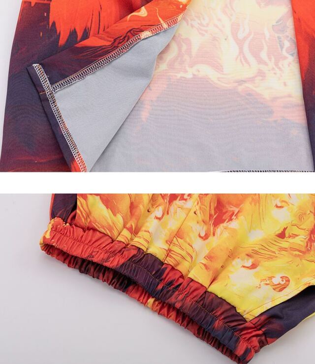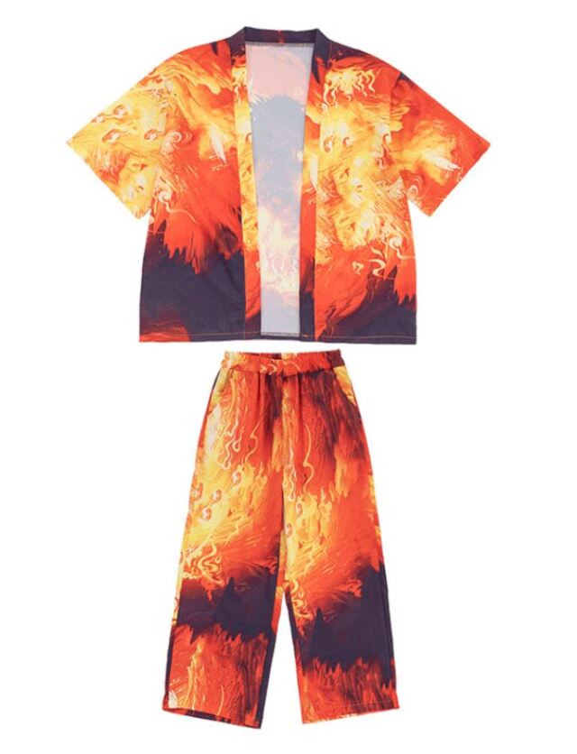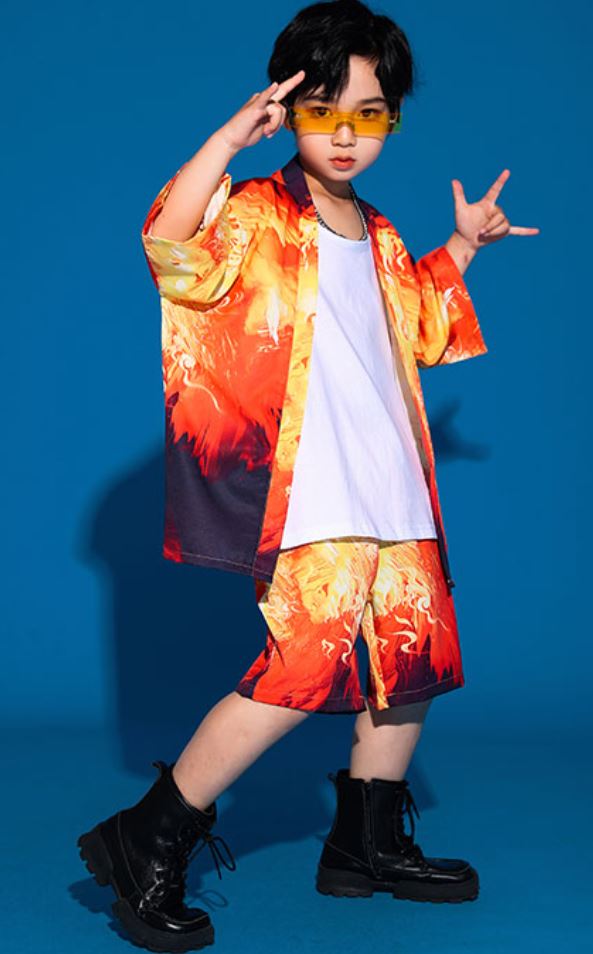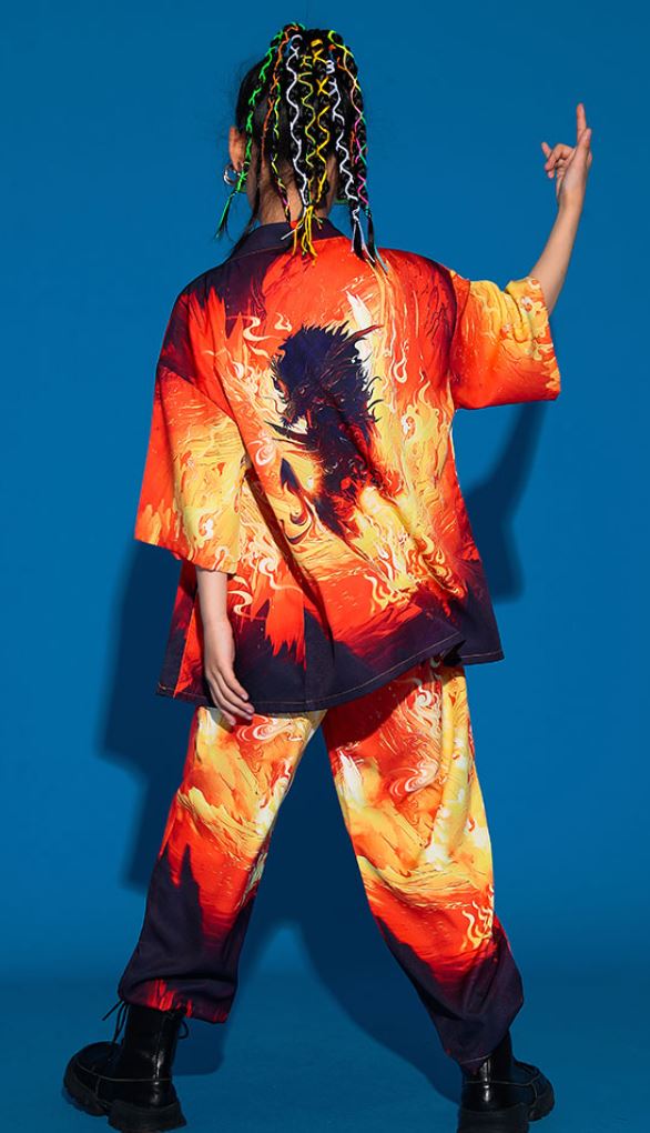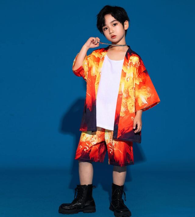 レッドカラーに炎デザインが入った個性的なセットアップ。ハーフパンツセットとロングパンツセットから選べ、半袖シャツまたは長袖シャツとパンツの2点セット。110cmから180cmまでの幅広いサイズ展開で、男女兼用デザイン。赤色と炎柄が迫力のあるデザインで、ヒップホップダンスやストリートファッションとして人気。かっこいいグラフィックデザインがレッスンから普段着まで活躍します。
