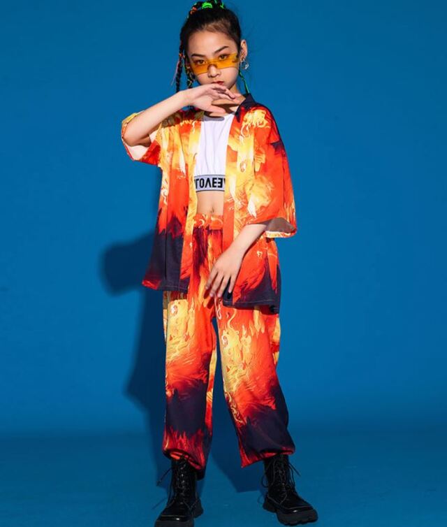キッズダンス衣装 セットアップ ヒップホップ hiphop シャツ トップス 半袖 ハーフパンツ 赤 レッド 炎 シャツ 長袖 シャツ 長ズボン ロングパンツ パンツ 子供 キッズ ダンス 衣装 女の子 男の子