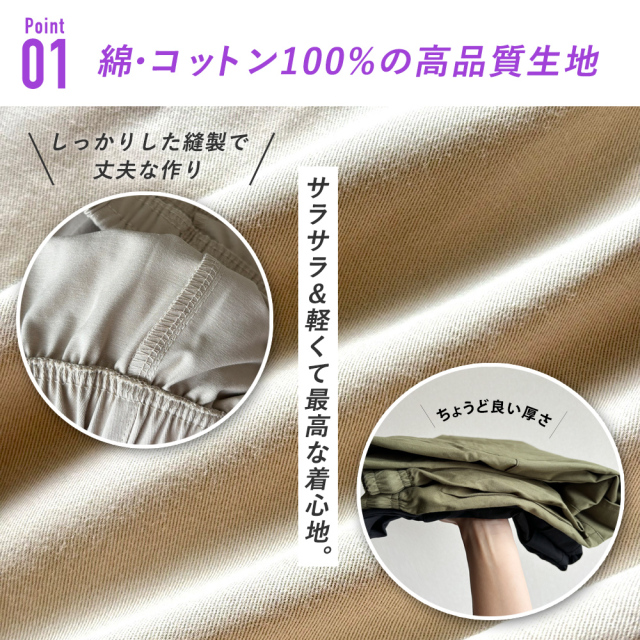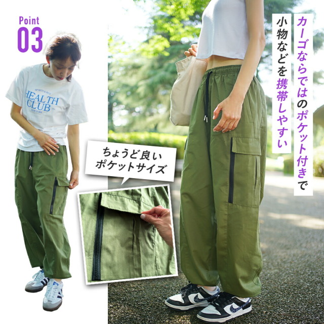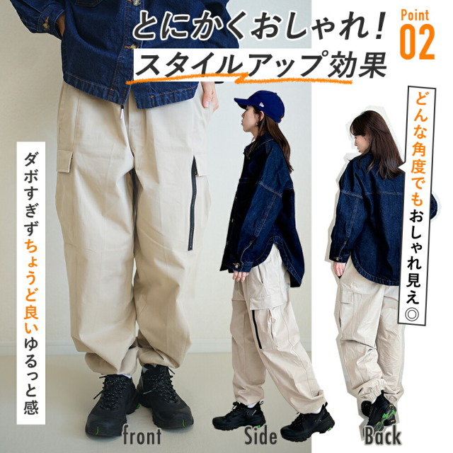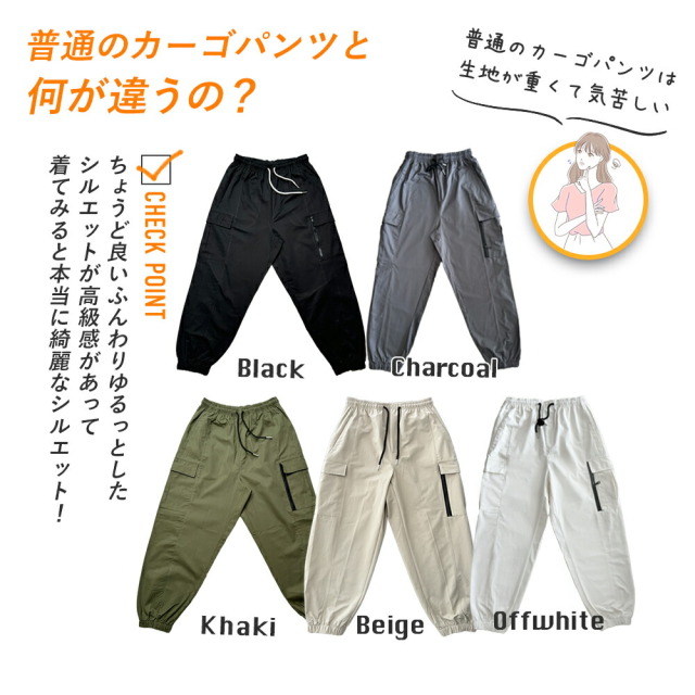 ゆったりシルエットのレディースカーゴパンツ。大容量の機能的なポケットと丈夫な作りが特徴で、作業着としてもきれいめカジュアルとしても使える多用途デザイン。薄手で涼しい素材を使用し、夏の暑い季節も快適に過ごせます。ダンスレッスン・ストリートファッション・カジュアルな日常使いまで幅広いシーンで活躍し、5色展開・4サイズ対応で体型やスタイルを問わずお選びいただけます。