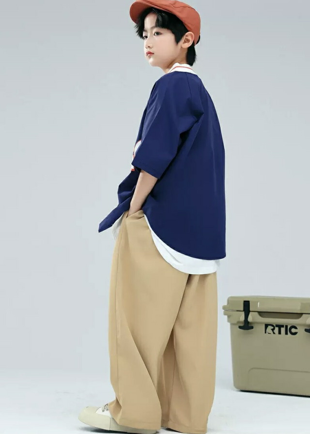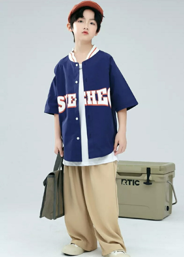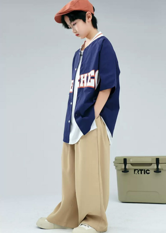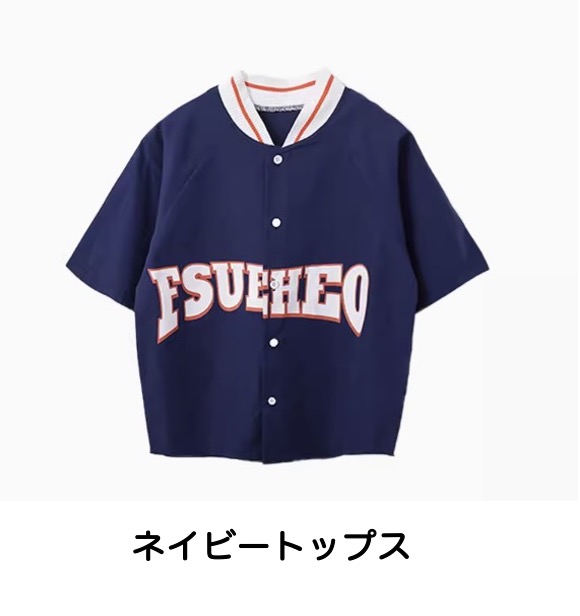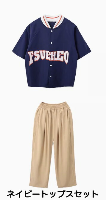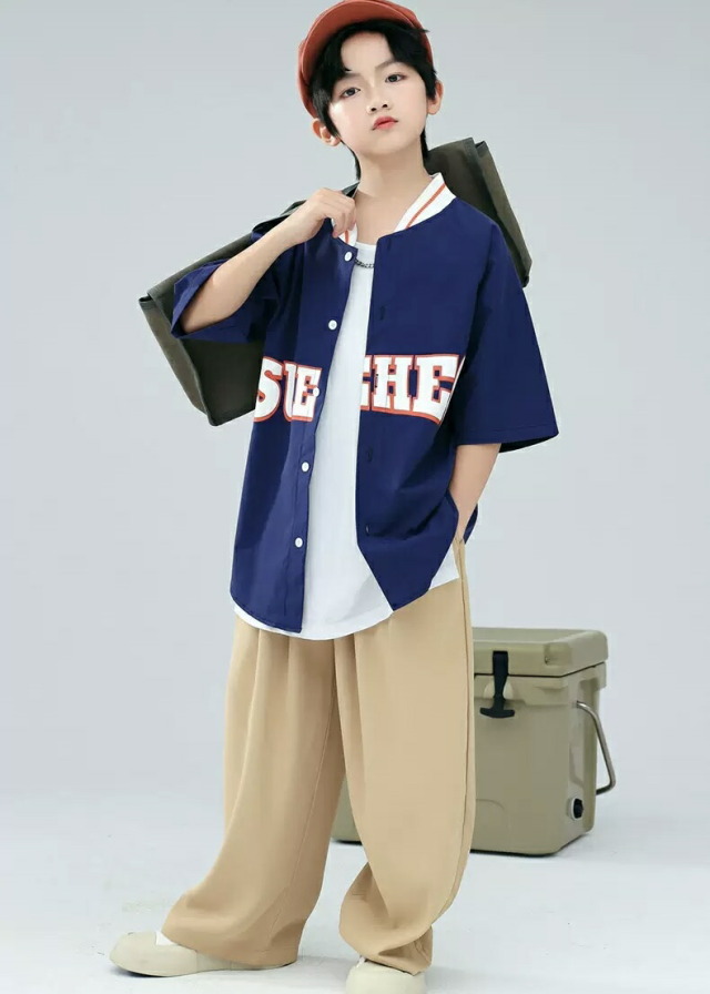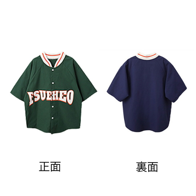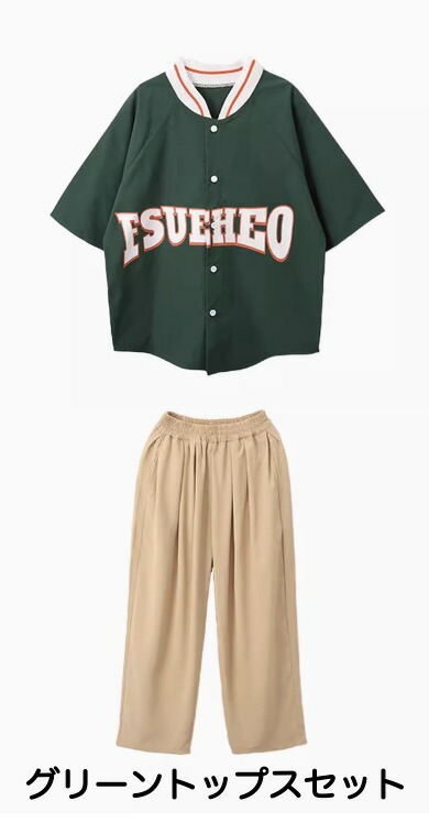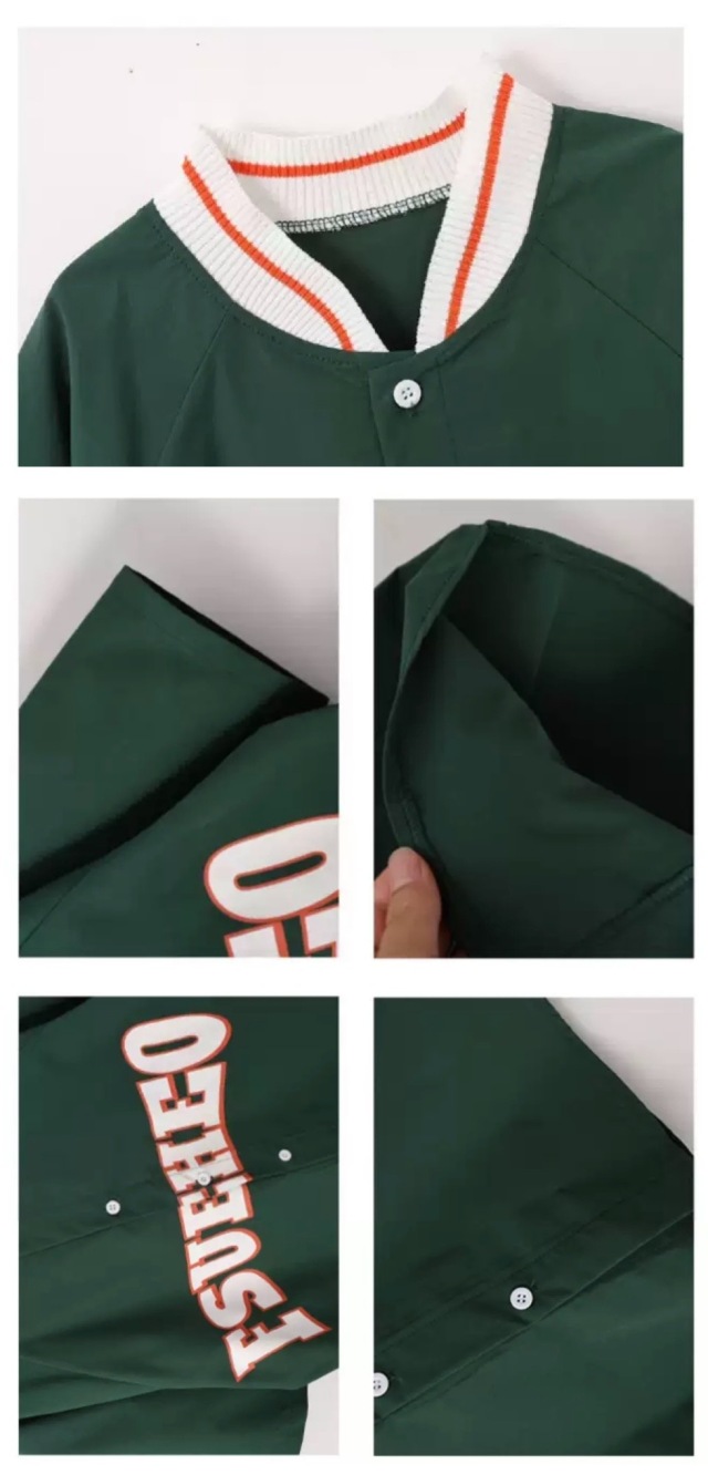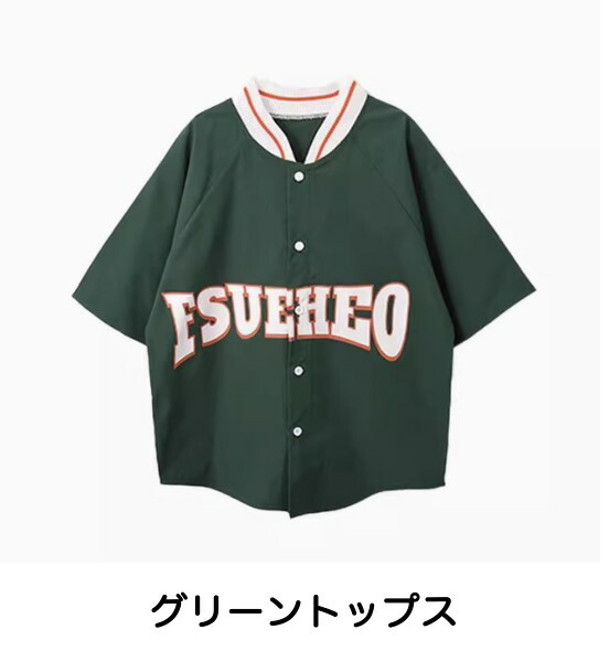 グリーンとネイビーのベースボールシャツタイプのトップスで、スタジャンスタイルが人気。グリーントップスセット、ネイビートップスセット、各単品から選べます。110cmから180cmまでの幅広いサイズ展開で、緑と紺のベージュを組み合わせたベースボールデザイン。男女兼用でヒップホップダンスやストリートファッションの練習着に最適。スポーティーなデザインでダンスレッスンから普段着まで活躍します。