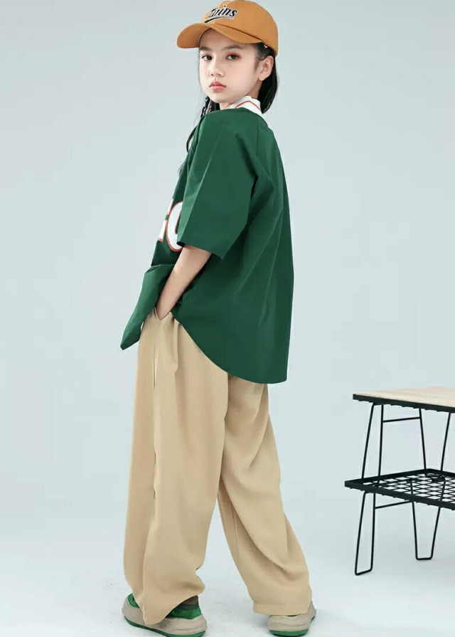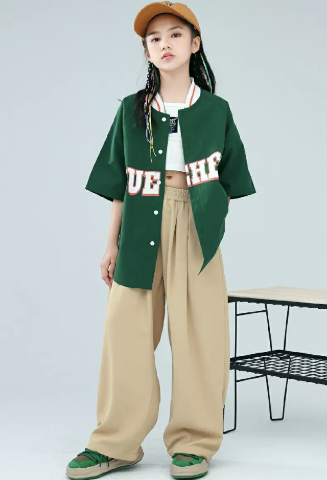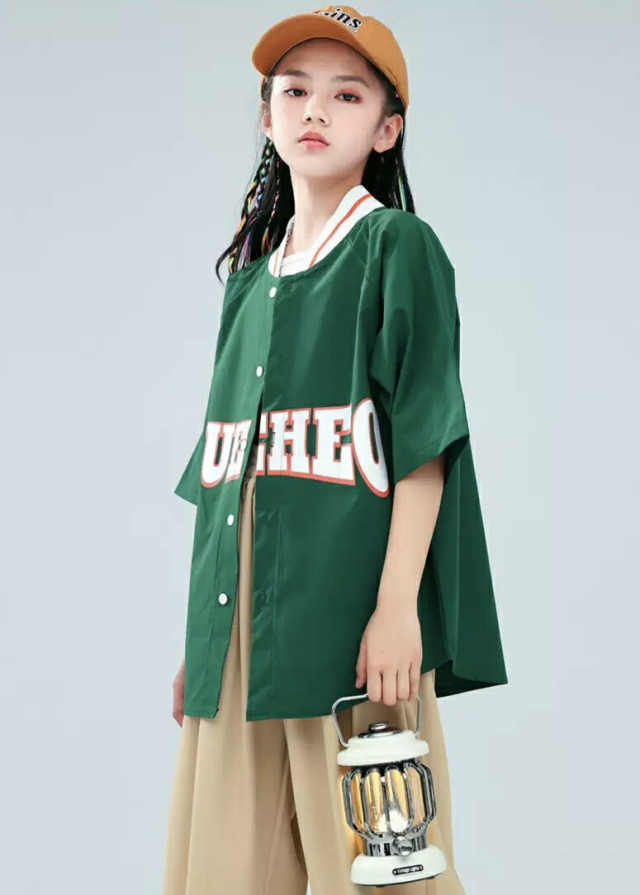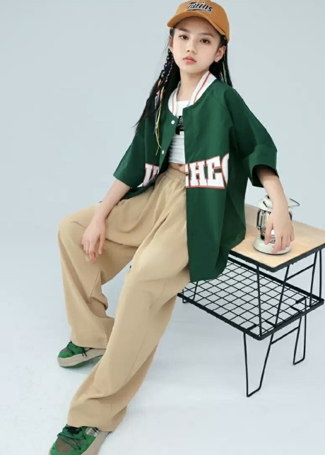 キッズ ダンス 衣装 トップス ヒップホップ 半袖 練習着 グリーン ネイビー 緑 ストリート スタジャン ベースボールシャツ kpop hiphop 子供 女の子 男の子 キッズダンス衣装