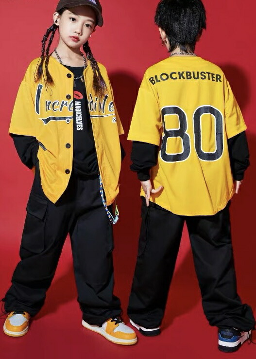 キッズ ダンス 衣装 黄色 ベースボールシャツ 野球 トップス 水色 紫 緑 赤 白 ヒップホップ hiphop kpop 韓国 ストリート 子供 女の子 男の子
