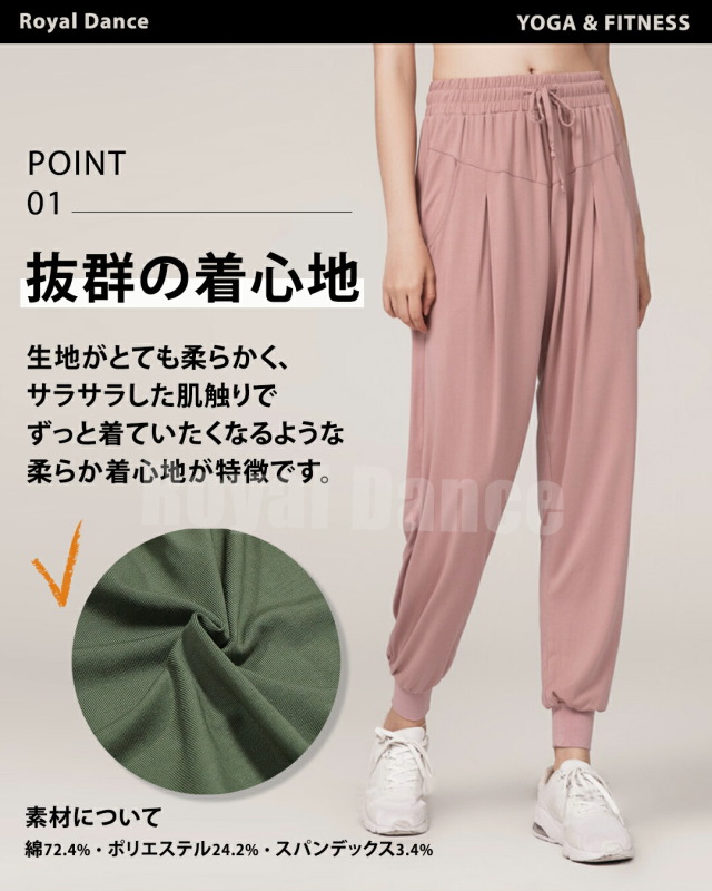 フィットネスやヨガ、ダンスに最適なジョガーパンツ。カーキ、ダークグレー、パープル、ピンク、ブラックの5色展開で、綿素材の柔らかさと伸縮性が魅力です。速乾性があり、トレーニング後も快適。部屋着や練習着としても使えるイージーパンツで、リラックスタイムにもぴったり。美脚効果のあるシルエットで、体型を美しく見せてくれます。