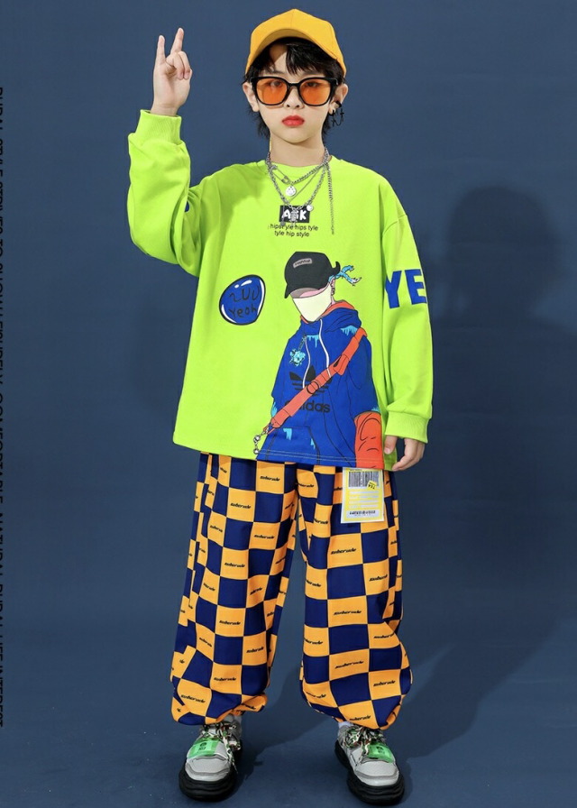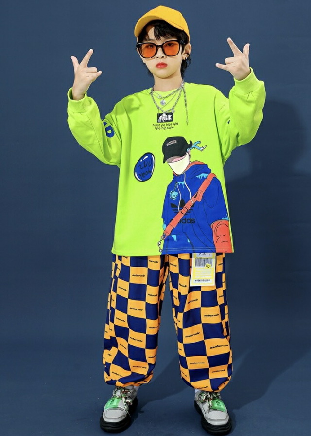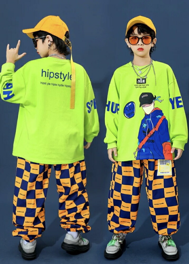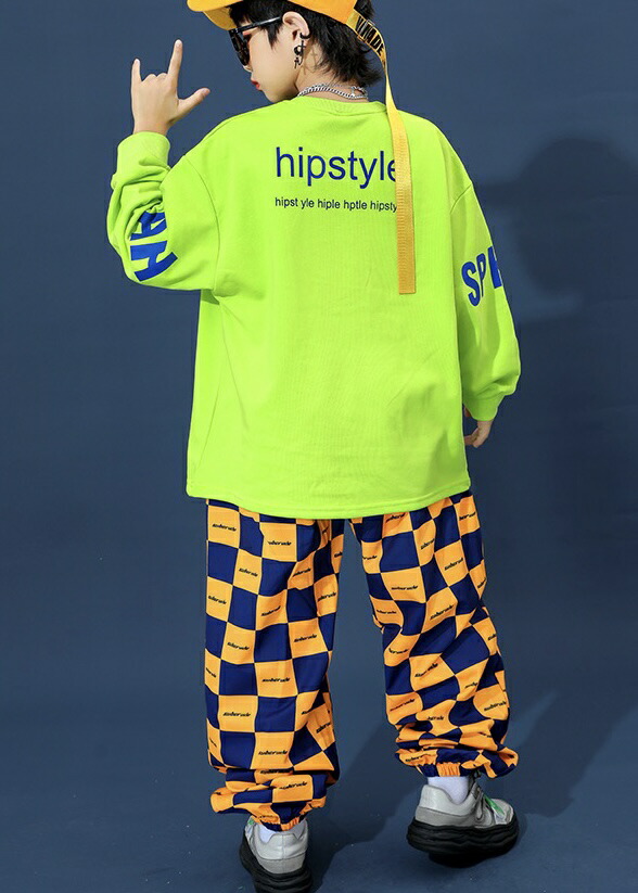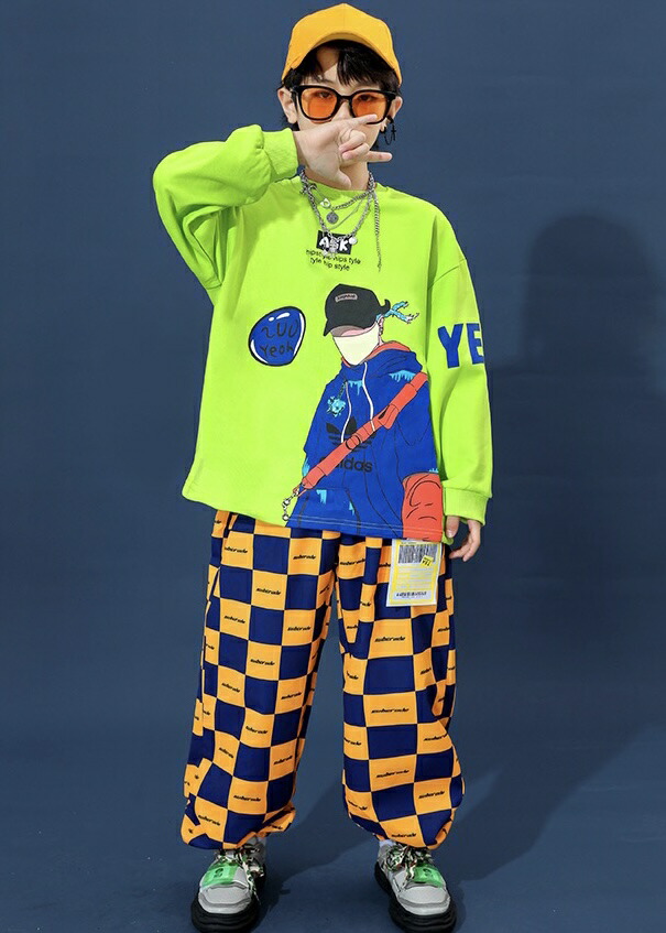 キッズダンス衣装 セットアップ ヒップホップ グリーン 長袖 トップス チェッカー パンツ キッズ ダンス 衣装 hiphop kpop 韓国 ストリート 子供 女の子 男の子