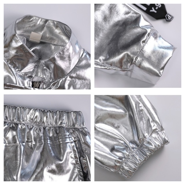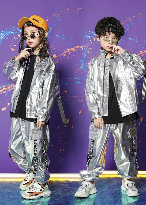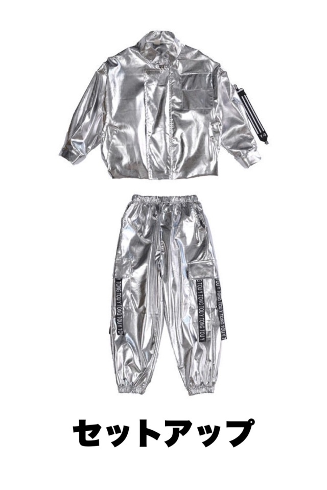 シルバーカラーが個性的なセットアップ。ジャケットとカーゴパンツの組み合わせで、ヒップホップダンスに最適です。セットアップ、トップス単品、パンツ単品から選べる柔軟性が魅力。110cmから180cmまでの幅広いサイズ展開で、男の子も女の子も着用可能。韓国ストリートファッションとしても人気で、レッスンから発表会、普段着まで幅広いシーンで活躍します。