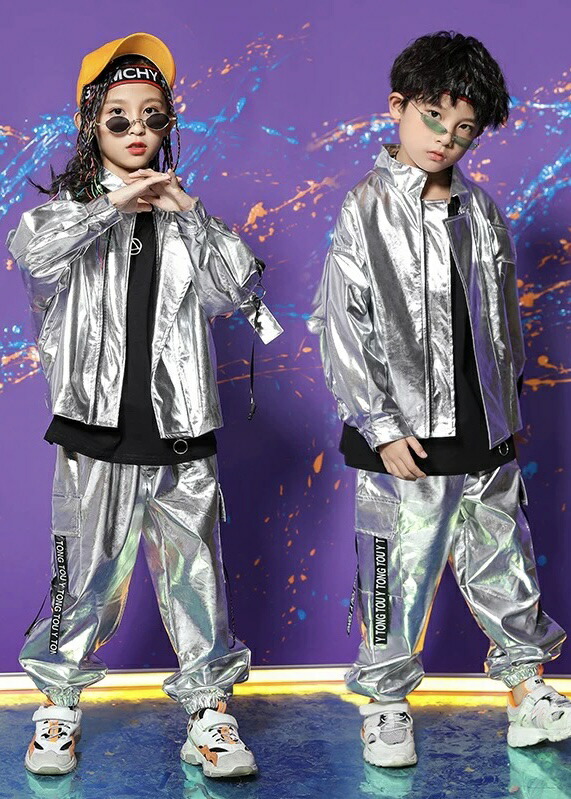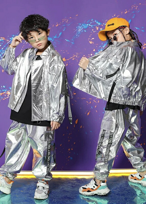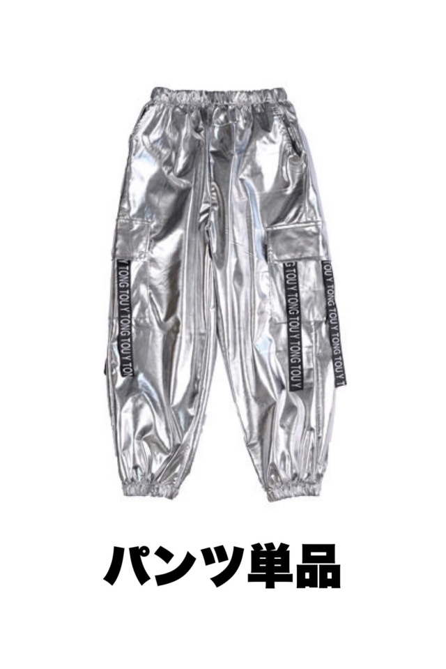キッズダンス衣装 セットアップ トップス パンツ シルバーカーゴパンツ ヒップホップ 子供 kpop 韓国 ストリート hiphop 子供服 女の子 男の子 キッズ ダンス 衣装