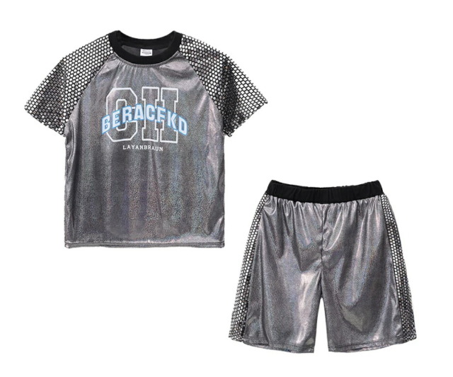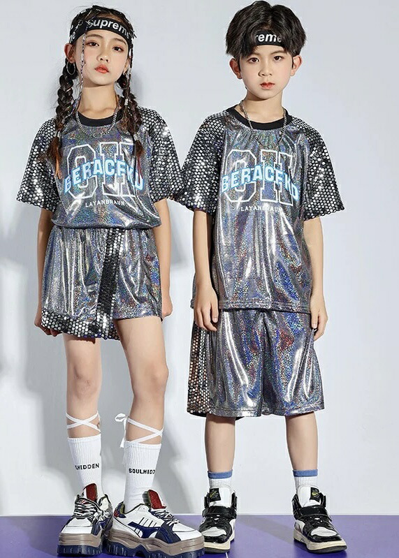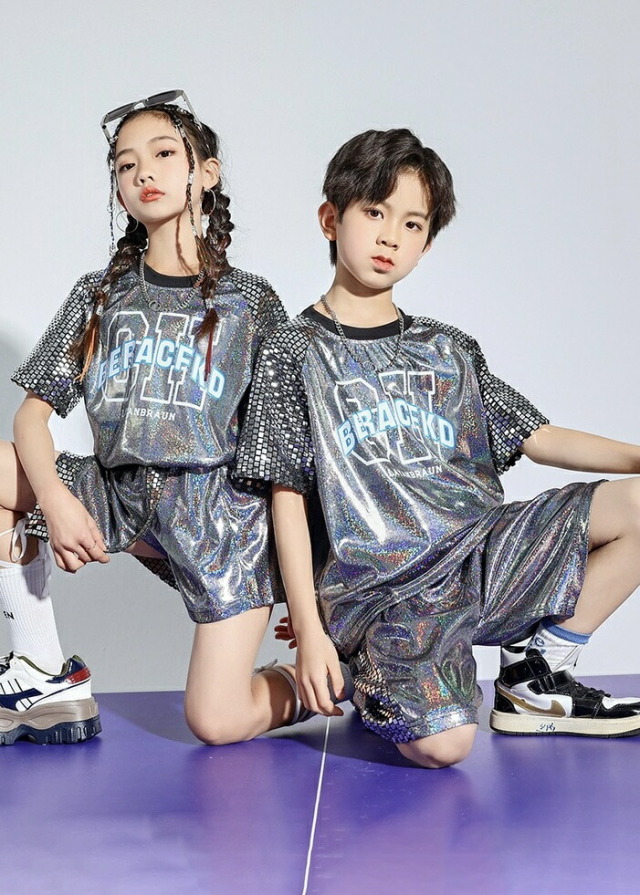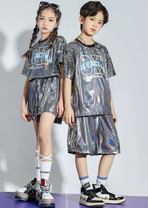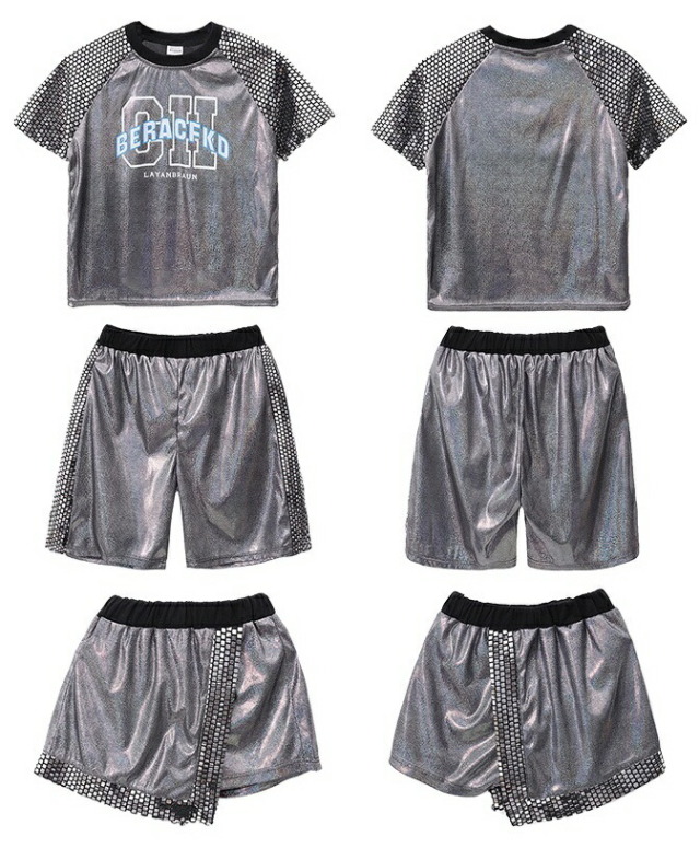 シルバーのきらきらセットアップで、半袖シャツとハーフパンツの2点セット。男の子セットと女の子セットから選べ、110cmから180cmまでの幅広いサイズ展開。銀色の輝きがステージ映えし、発表会やステージ衣装に最適。ヒップホップダンスや韓国ファッションとしてかっこよく、シルバーの華やかなデザインでダンスレッスンから発表会まで幅広く活躍します。