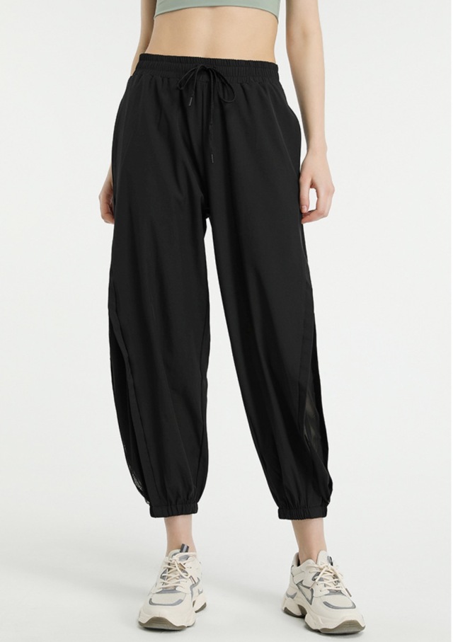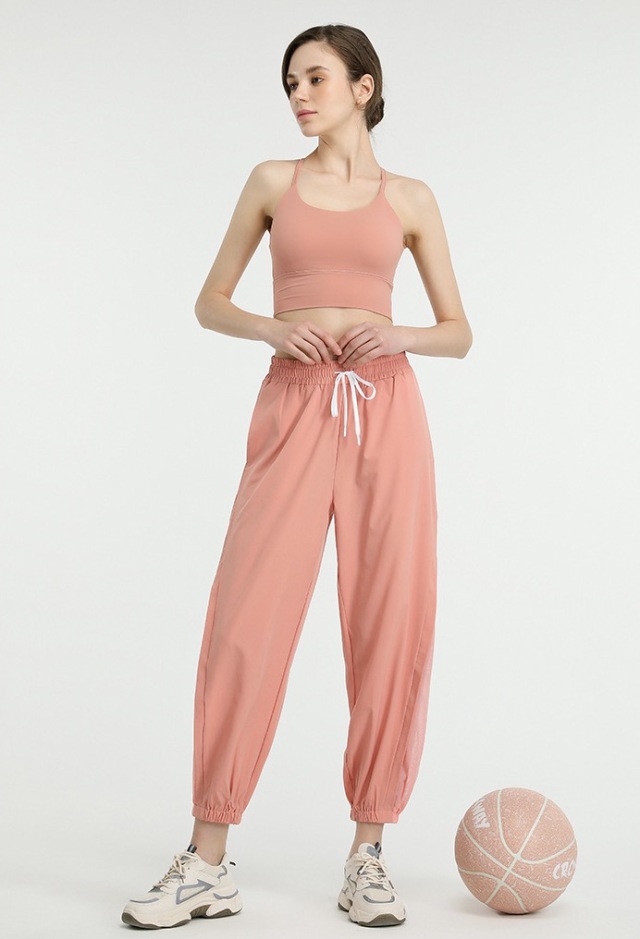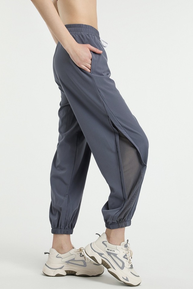 フィットネス向けヨガパンツで、スリット入りのジョガーパンツタイプ。S、M、Lのレディースサイズで、ポリエステル95%、スパンデックス5%の素材。ブラック、薄ピンク、ブルーグレーの3色展開で、黒、ピンク、灰色が選べます。女性向けの運動着として、ヨガ、エアロビクス、ピラティス、ジョギング、トレーニングのレッスン着から部屋着まで幅広く活躍します。