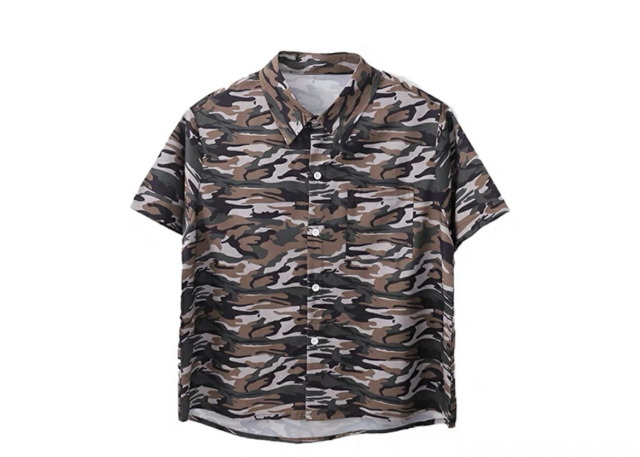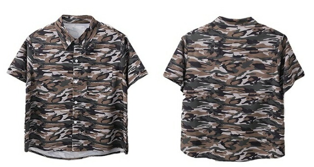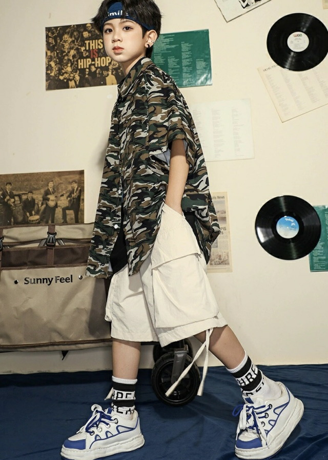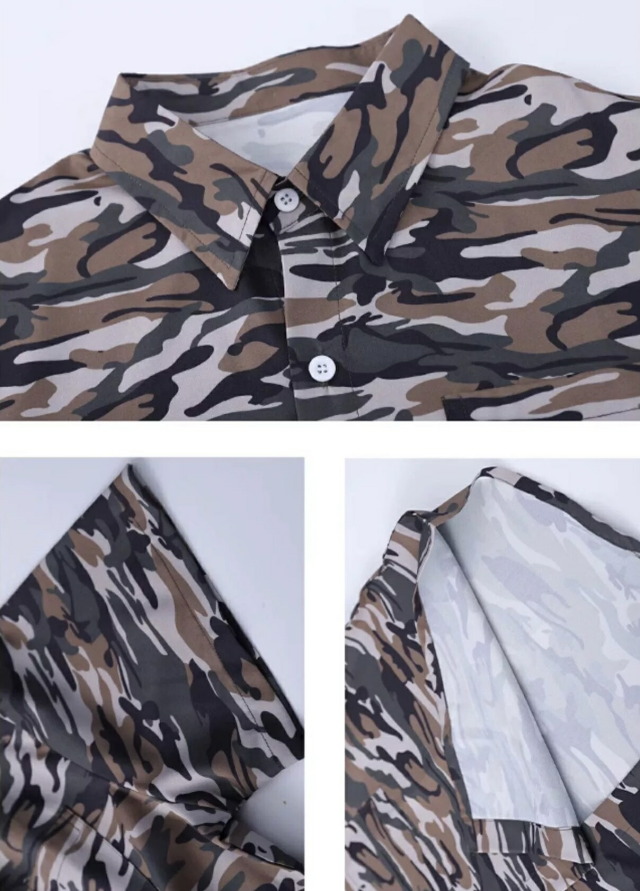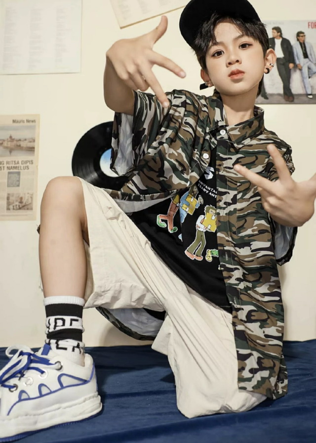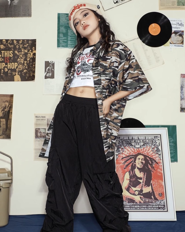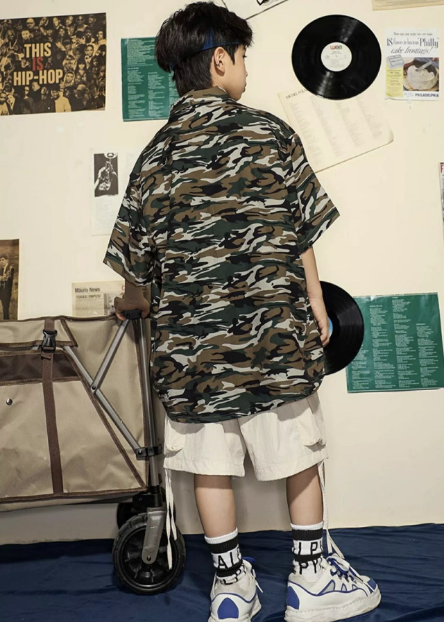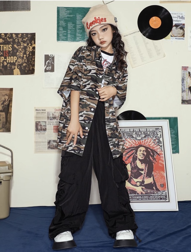 迷彩柄の半袖シャツで、カモフラージュデザインが個性的。110cmから180cmまでの幅広いサイズ展開で、男女兼用のトップス。迷彩柄がかっこよく、ロゴデザイン入りで、ヒップホップダンスや韓国ストリートファッションの練習着として人気。カモフラージュ柄のおしゃれなシャツで、ダンスレッスンから普段着まで幅広く活躍するアイテムです。