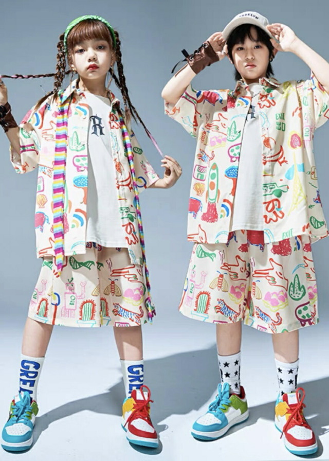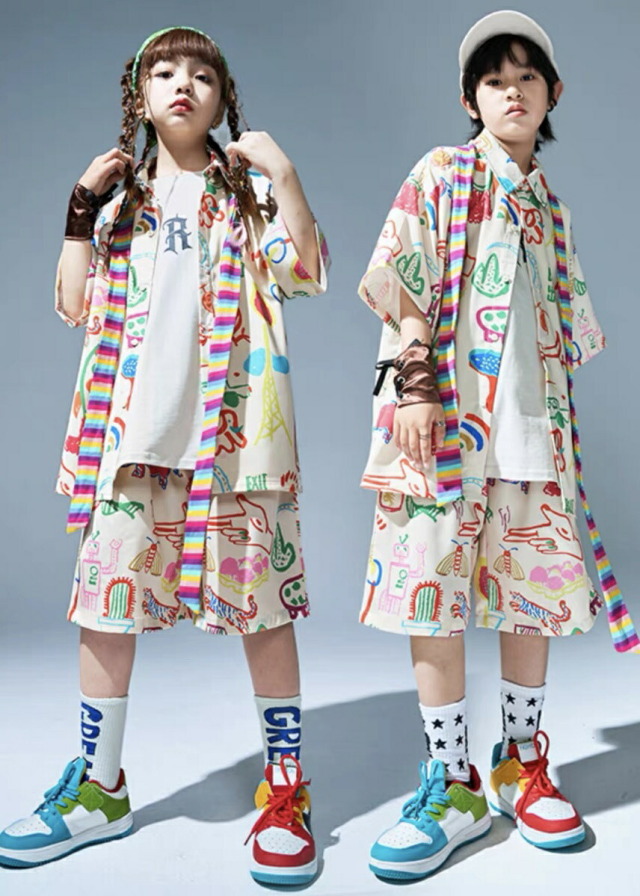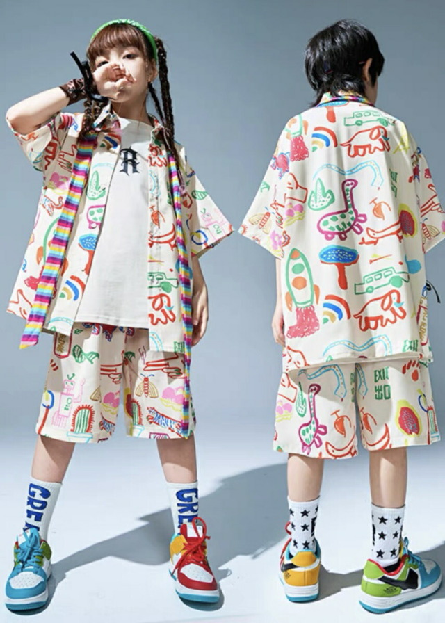 半袖シャツとハーフパンツのセットアップで、トップスとパンツの2点セット。110cmから180cmまでの幅広いサイズ展開で、男女兼用デザイン。半袖のシャツとハーフパンツの夏向けスタイルがかっこよく、ヒップホップダンスや韓国ストリートファッションとして人気。涼しい組み合わせで、ダンスレッスンから普段着まで幅広く活躍するアイテムです。