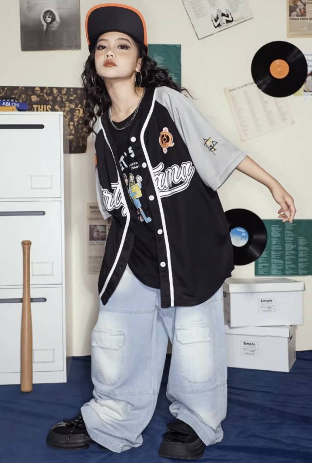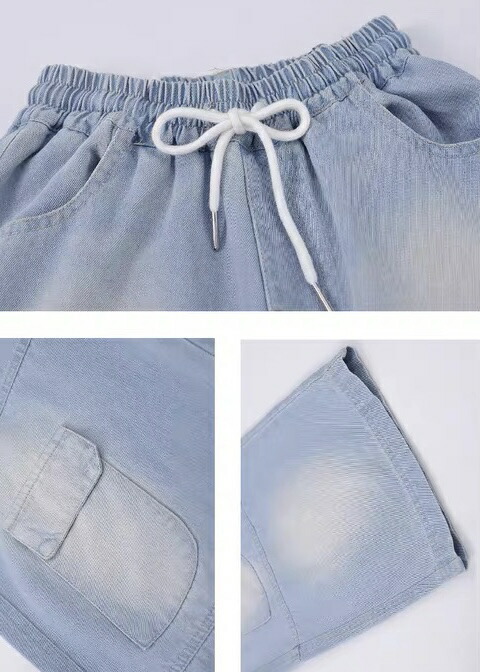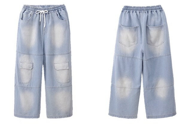 デニムカーゴパンツで、ジーンズ素材のボトムス。110cmから180cmまでの幅広いサイズ展開で、男女兼用のガールズ向けパンツ。ダボっとしたシルエットがかわいらしく、程よいヴィンテージウォッシング感とおしゃれな色合いが特徴。ウエストゴム入りで踊りやすく、ヒップホップダンスや韓国ストリートファッションとして、ダンスレッスンから普段着まで活躍します。