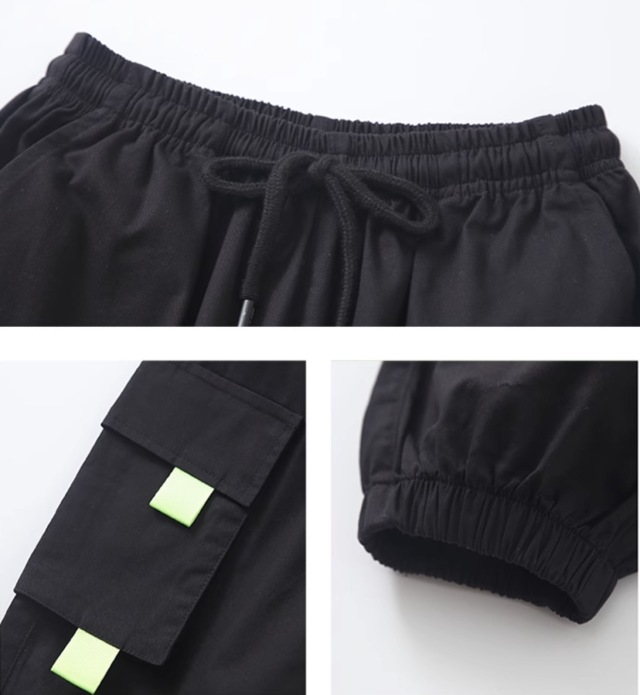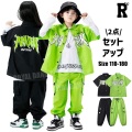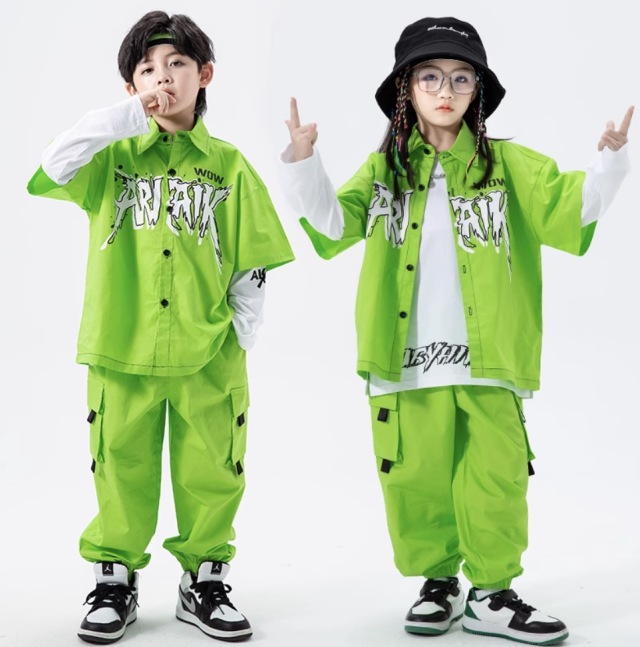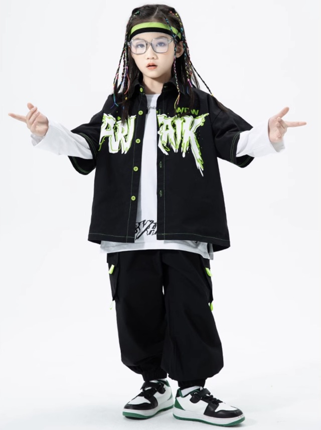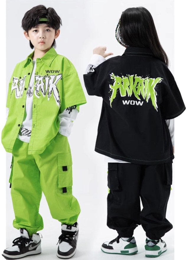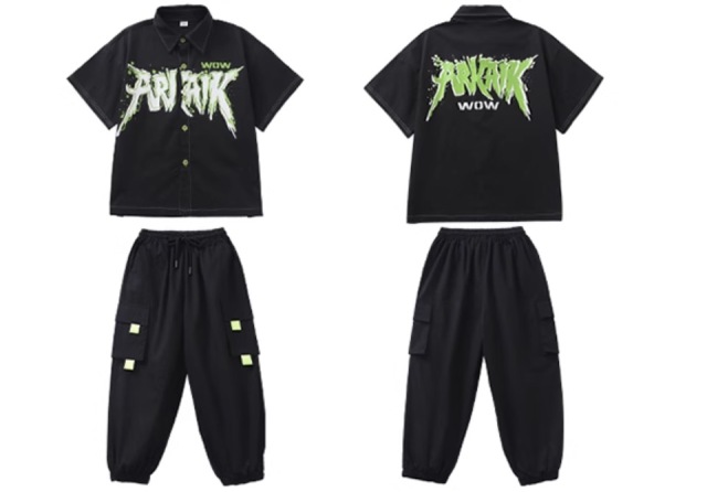 キッズダンス衣装 半袖 セットアップ トップス パンツ ブラック 黒 グリーン 緑 綿 カーゴパンツ ヒップホップ hiphop kpop 韓国 子供 キッズ ダンス衣装 女の子 男の子