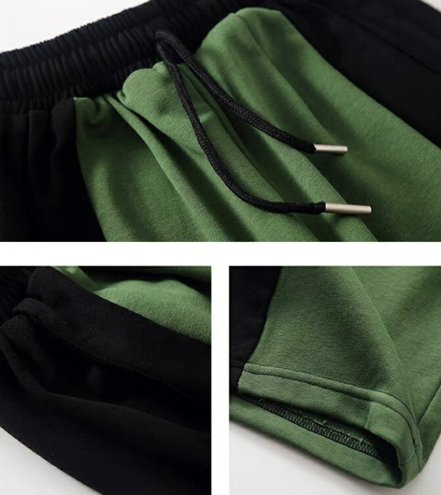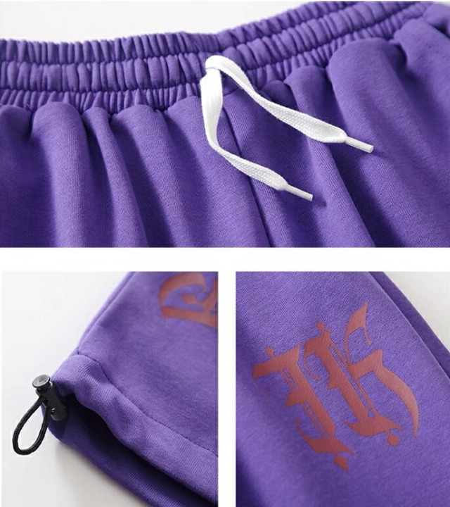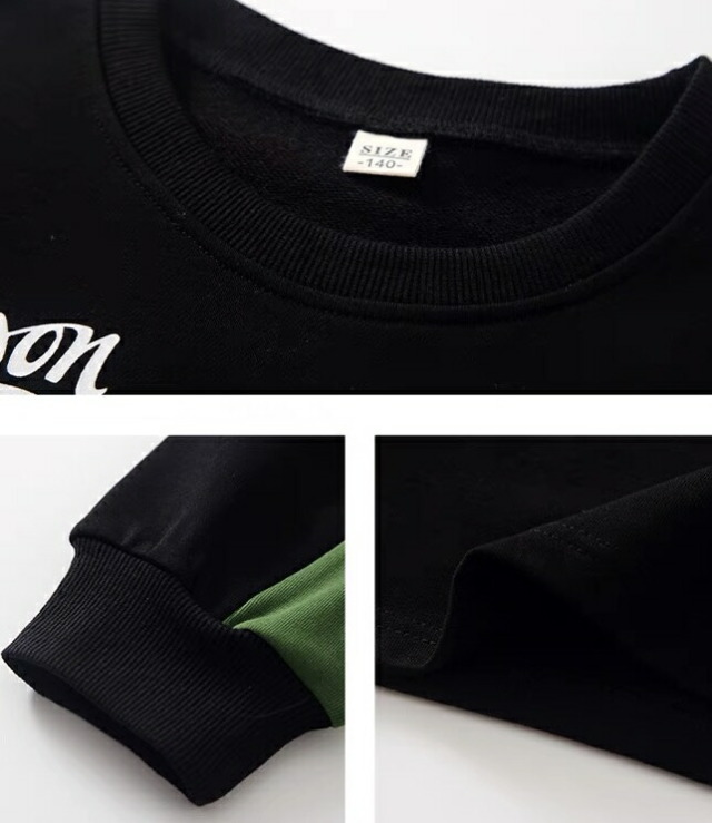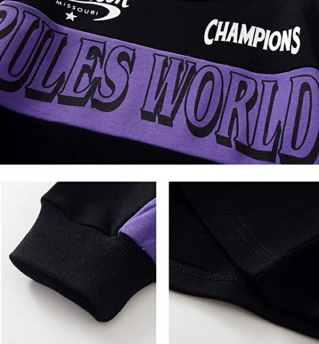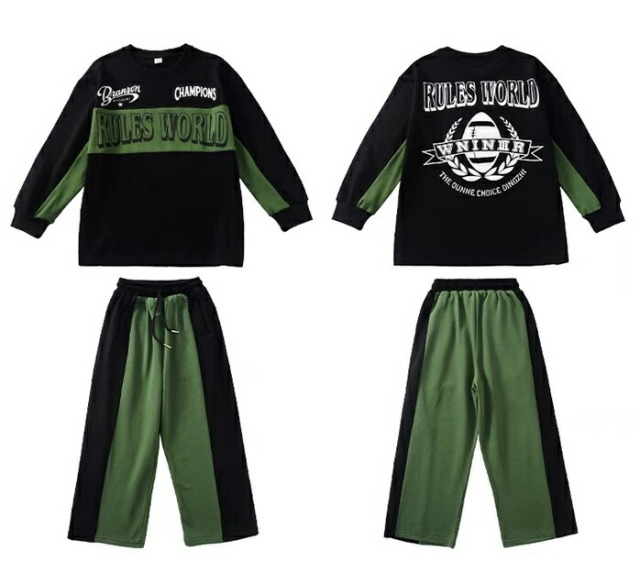 グリーンとパープルの長袖スウェットセットアップで、トップスとパンツの2点セット。110cmから180cmまでの幅広いサイズ展開で、緑、黒、紫のカラーバリエーション。綿85%、ポリエステル15%のスウェット素材で、男女兼用デザイン。ヒップホップダンスや韓国ストリートファッションとしてかっこよく、ダンスレッスンから普段着まで幅広く活躍します。
