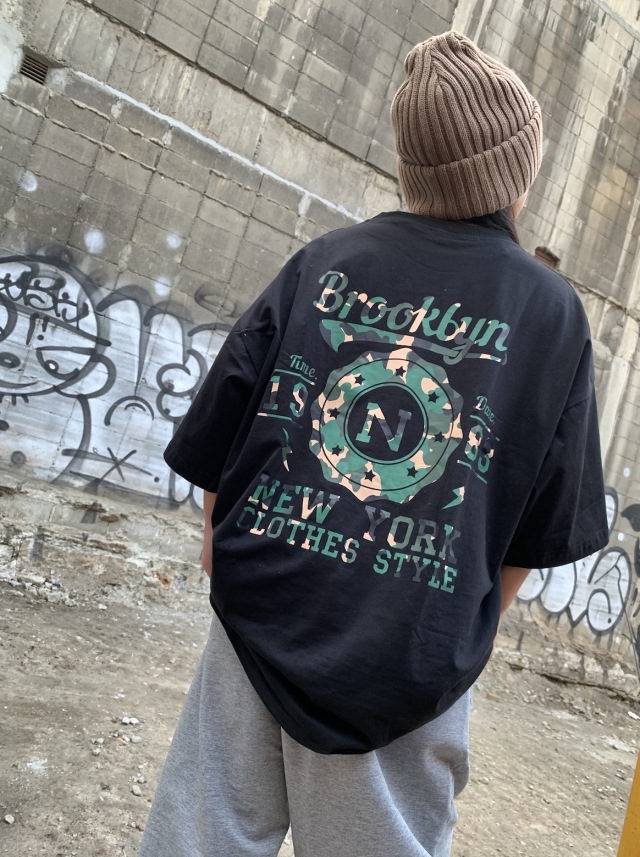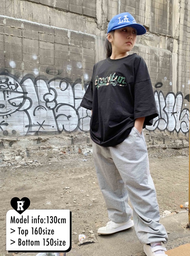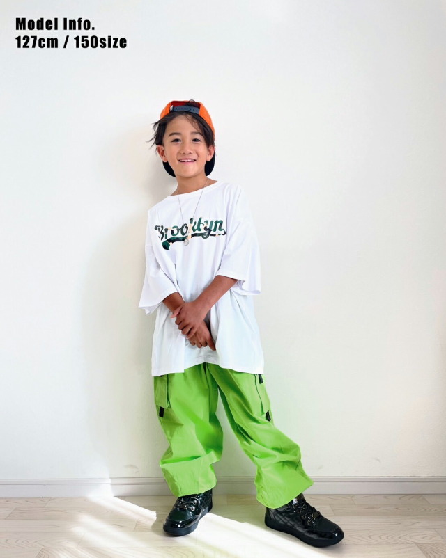 即納可能な半袖Tシャツで、ホワイトとブラックの2色展開。綿95%、ポリエステル5%のコットン素材で柔らかく快適な着心地です。正面と裏面にポイントロゴが入り、ゆったりオーバーフィットでスタイリッシュ。夏はもちろん、寒い時期もインナーとして活躍する万能アイテム。120cmから180cmまでのサイズ展開で、ヒップホップダンスの練習着やレッスン着、普段着としても使えます。