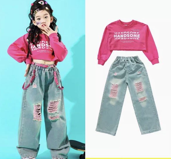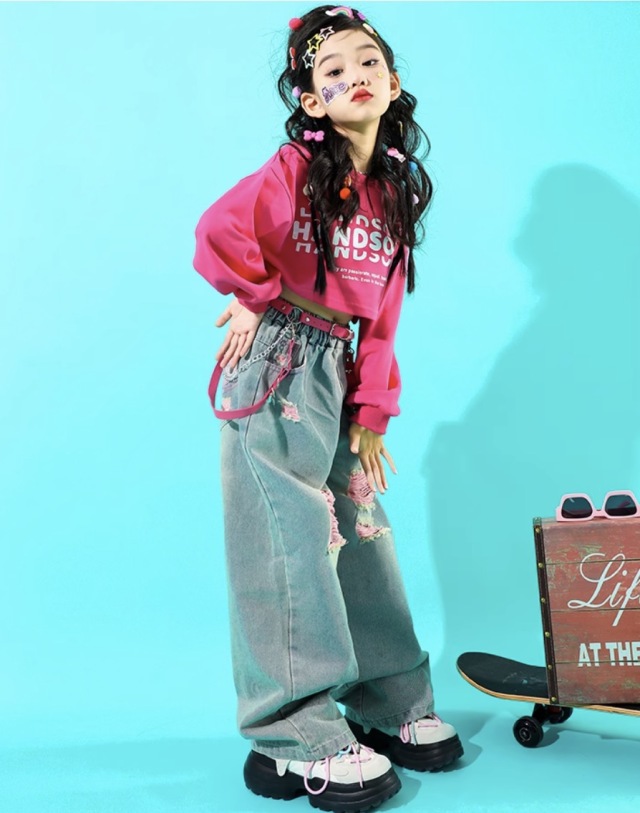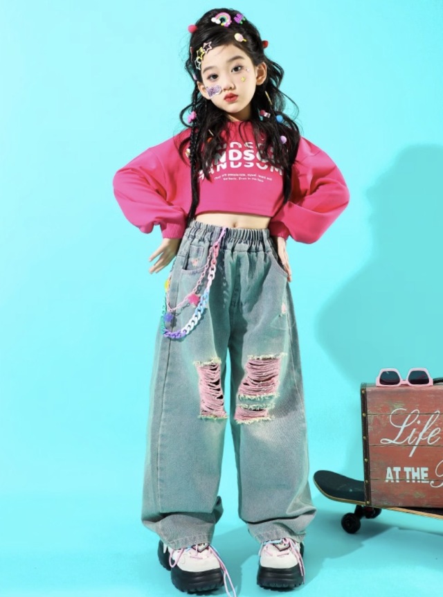 キッズダンス衣装 セットアップ ガールズ 長袖 ヘソ出し トップス パンツ ピンク ダメージデニム ヒップホップ トップス hiphop kpop 韓国 子供 キッズ ダンス衣装 女の子