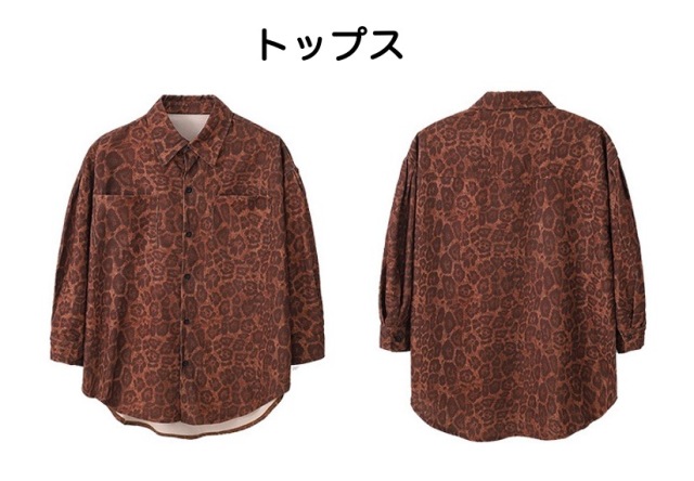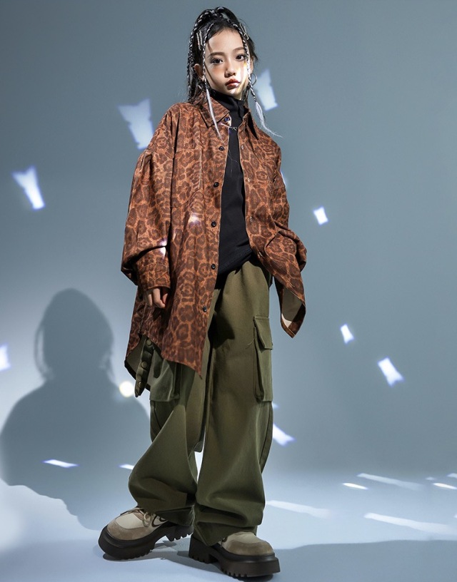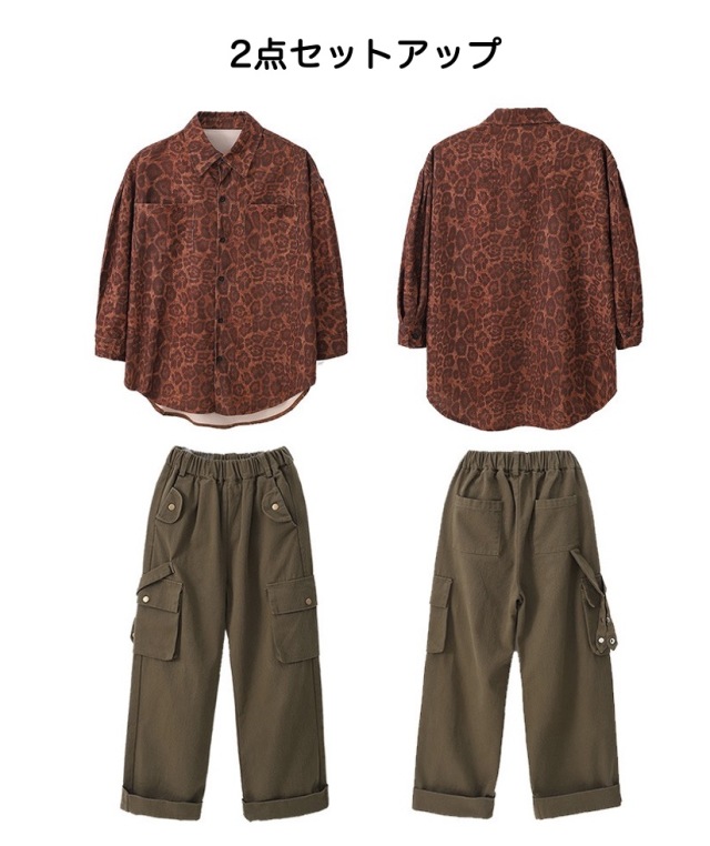 豹柄シャツとカーキグリーンカーゴパンツのセットアップで、2点セットアップ、トップス単品、パンツ単品から選べます。110cmから180cmまでの幅広いサイズ展開で、ヒョウ柄とカーキ色の組み合わせ。男女兼用デザインで、アニマル柄がかっこよく、ヒップホップダンスや韓国ファッションとして人気。ダンスレッスンから普段着まで幅広く活躍するアイテムです。