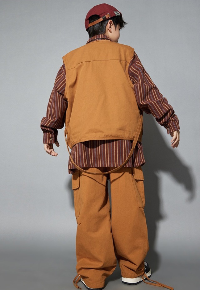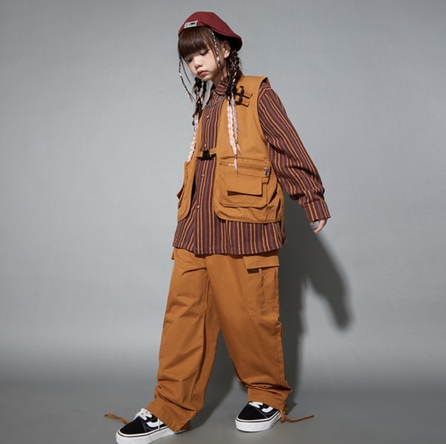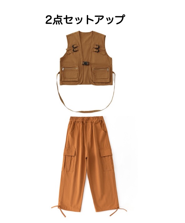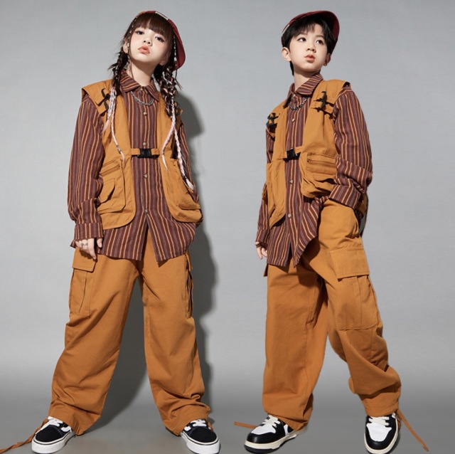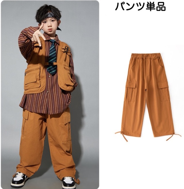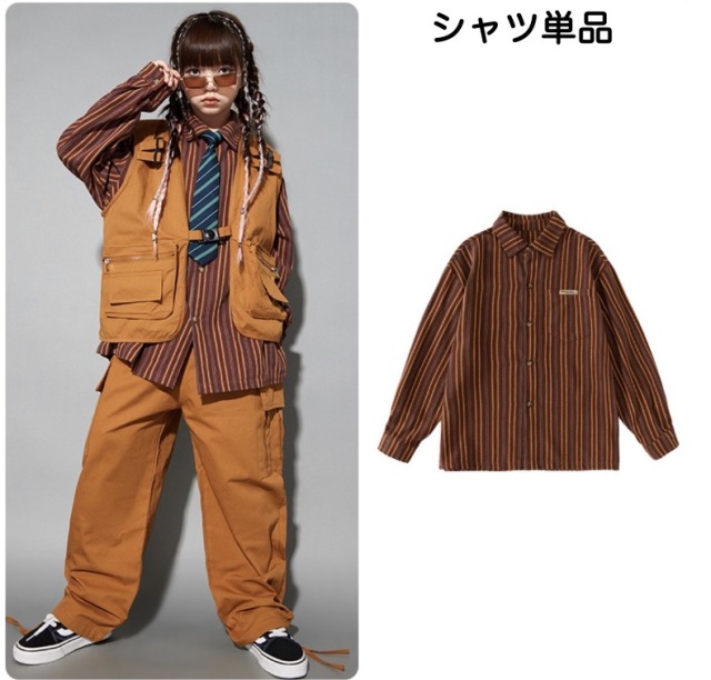 キッズダンス衣装 セットアップ ベスト トップス パンツ 長袖シャツ ブラウン 茶色 ゆったり ダボっヒップホップ hiphop kpop 韓国 子供 キッズ ダンス衣装 女の子 男の子