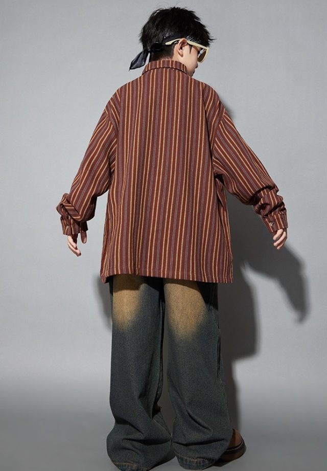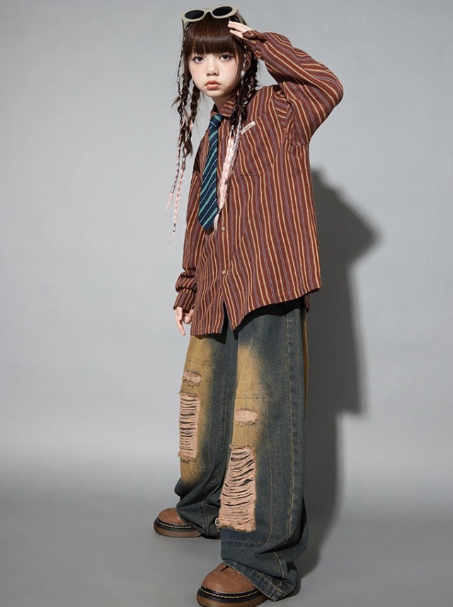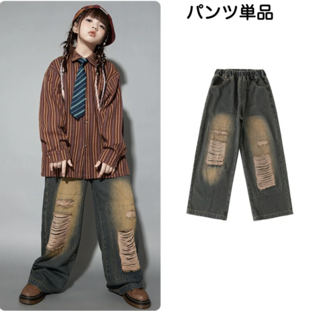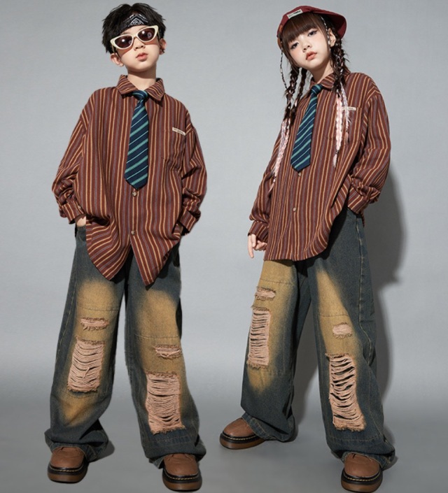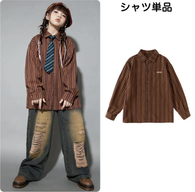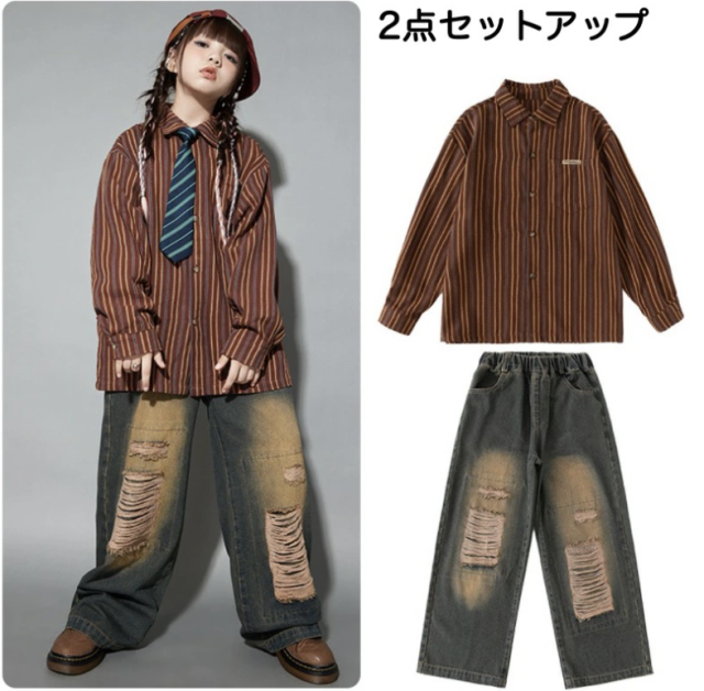 ブラックのダメージデニムパンツとブラウンの長袖シャツのセットアップで、2点セットアップ、シャツ単品、パンツ単品から選べます。110cmから180cmまでの幅広いサイズ展開で、黒のダメージ加工デニムと茶色のシャツ。ネクタイは含まれません。ダボダボシルエットがかっこよく、ヒップホップダンスや韓国ファッションとして、ダンスレッスンから普段着まで活躍します。