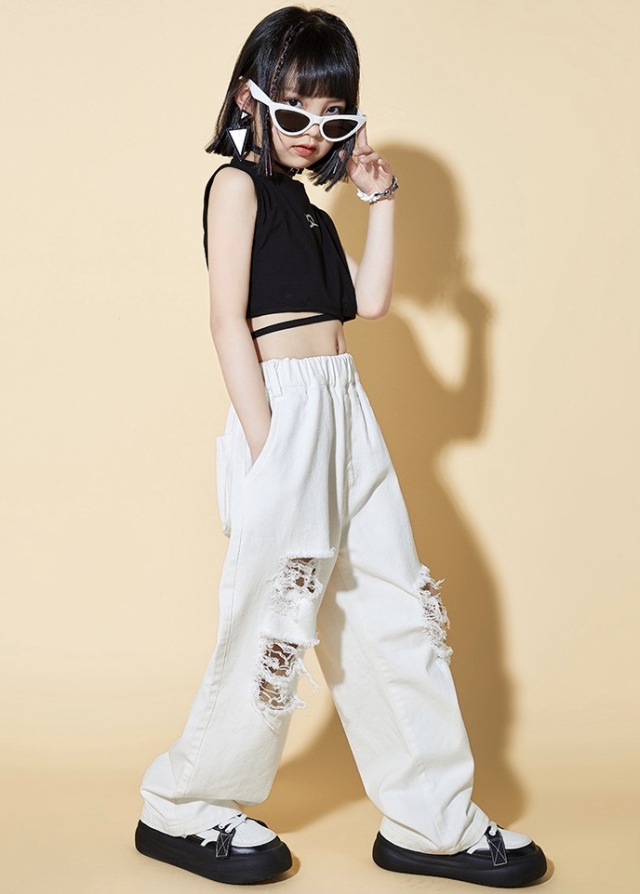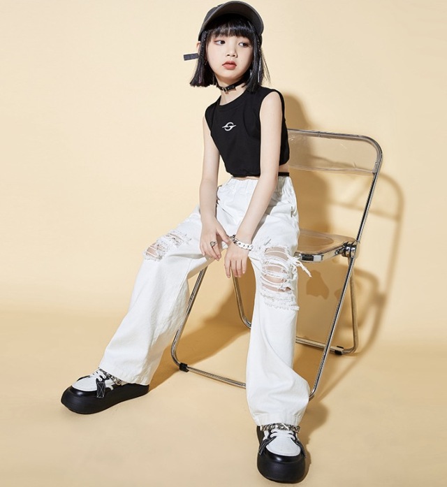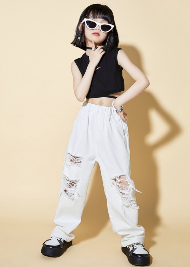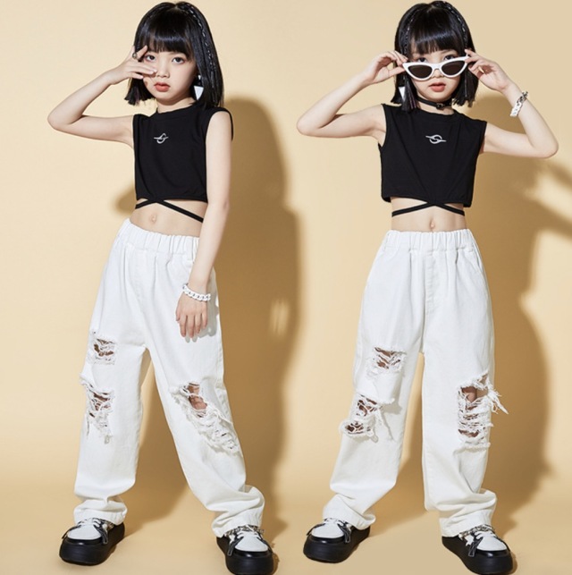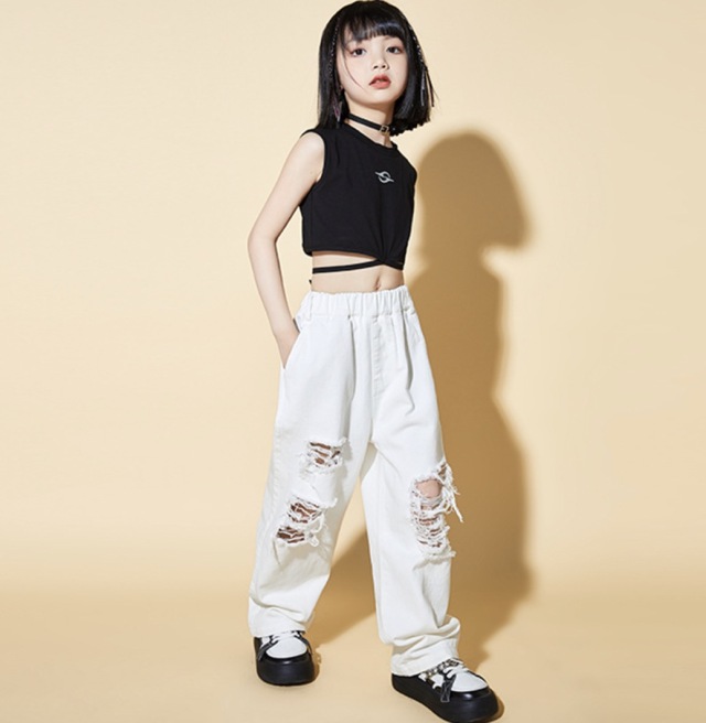 キッズ ダンス 衣装 ガールズ セットアップ タンクトップ デニム ダメージパンツ ホワイト 白 ヒップホップ hiphop kpop 韓国 子供 キッズ ダンス衣装 女の子
