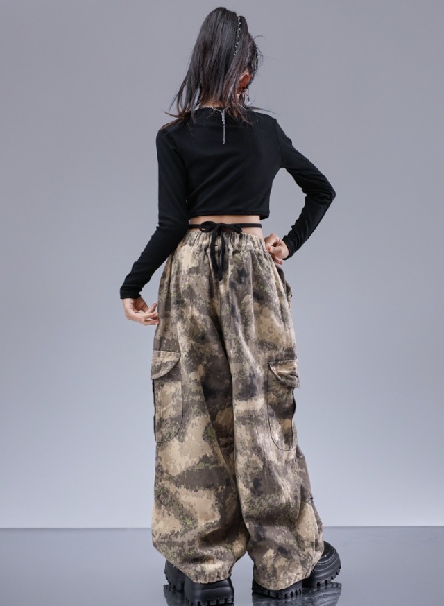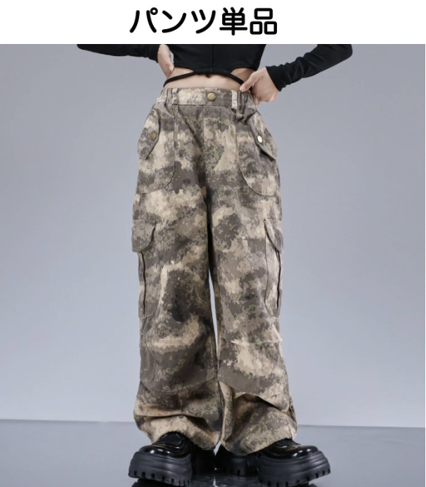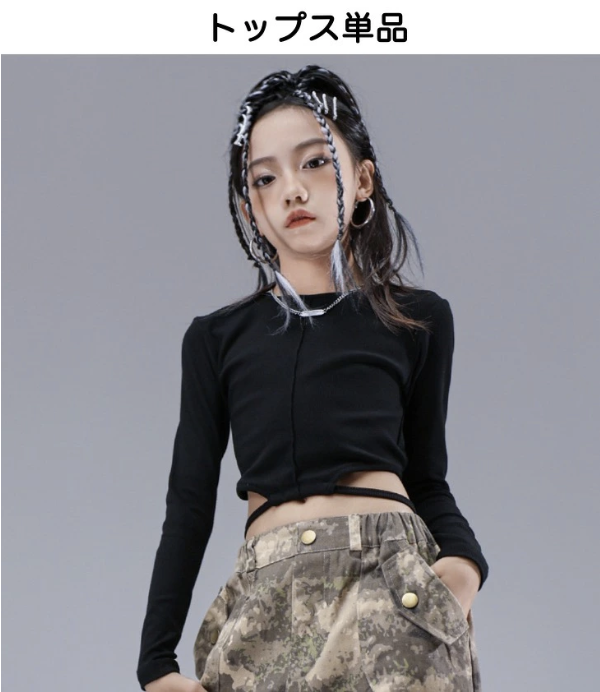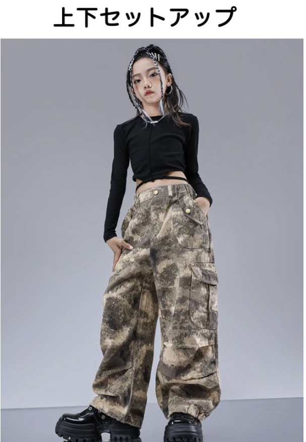 アースカラーの迷彩柄パンツとヘソ出しトップスのセットアップ。長袖のクロップド丈シャツとゆったりしたカモフラージュパンツで、ダボダボシルエットがヒップホップダンスにぴったり。ブラックを基調とした迷彩柄がストリートスタイルを格上げします。セットアップ、トップス単品、パンツ単品から選べます。110cmから180cmまでの豊富なサイズ展開で、かっこいいガールズ向けデザインが人気のアイテムです。