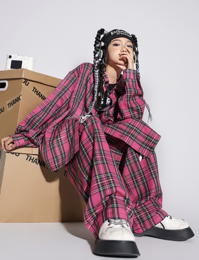 キッズダンス衣装 チェック柄 セットアップ トップス パンツ ピンク 長袖 シャツ チェック ヒップホップ ロック hiphop kpop 韓国 子供 キッズ ダンス衣装 女の子 男の子