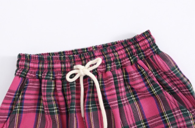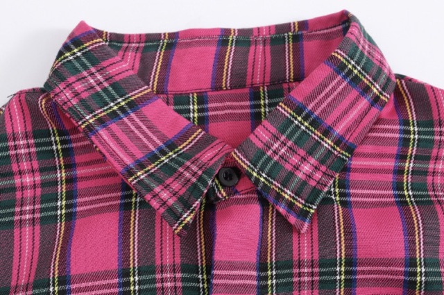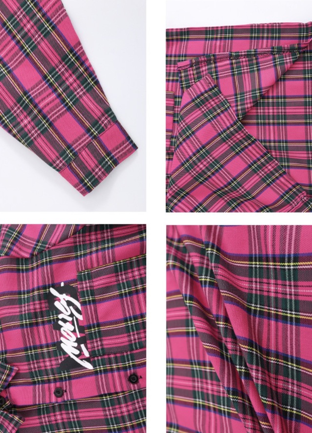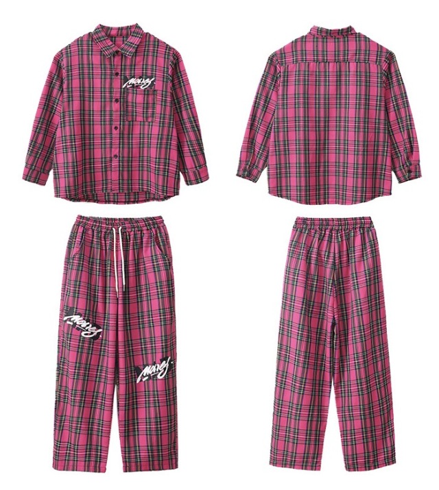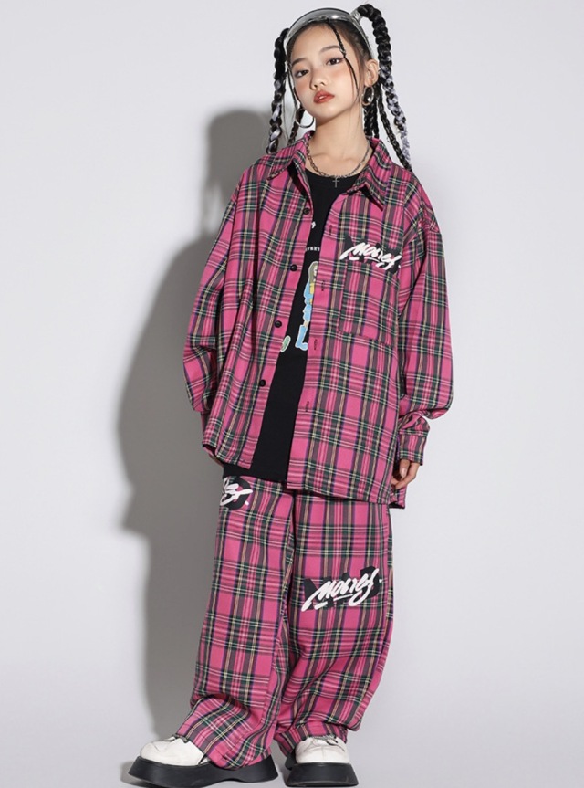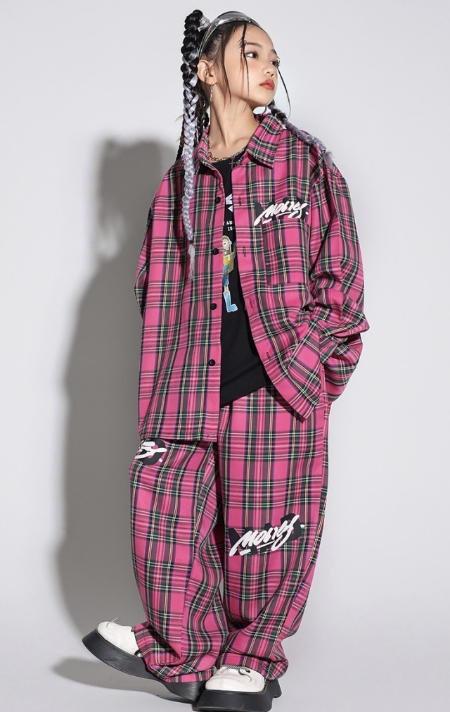 ピンクのチェック柄セットアップで、長袖シャツとパンツの上下セットアップ、トップス単品、パンツ単品から選べます。110cmから180cmまでの幅広いサイズ展開で、チェック柄とロゴデザイン入り。男女兼用デザインで、チェック柄がおしゃれ。ヒップホップダンスやロックダンス、韓国ストリートファッションとしてかっこよく、ダンスレッスンから普段着まで活躍します。