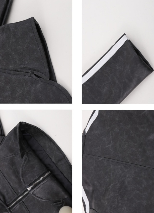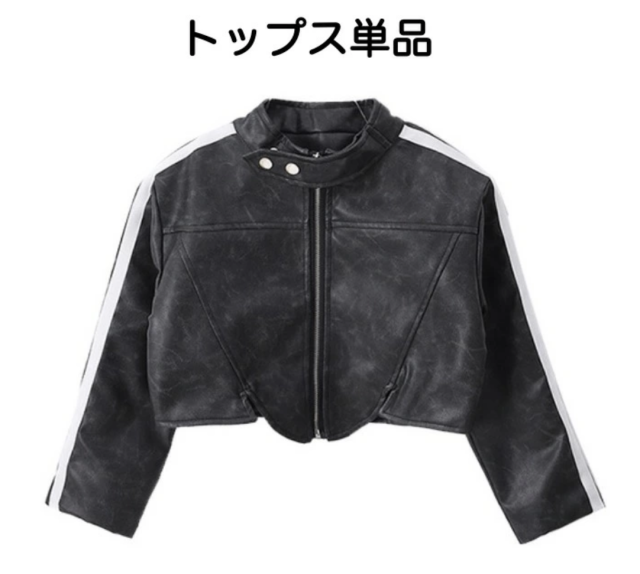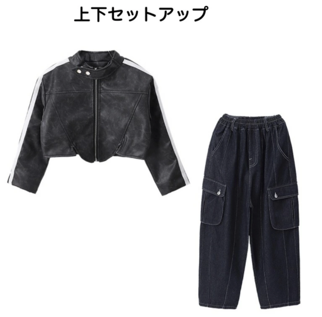 ブラックのショート丈ジャケットとデニムカーゴパンツのセットアップで、上下セットアップ、トップス単品、パンツ単品から選べます。110cmから180cmまでの幅広いサイズ展開で、長袖ヘソ出しデザイン。フェイクレザーのクロップド丈ジャケットとカーゴデニムパンツの組み合わせがかっこよく、ヒップホップダンスや韓国ファッションとして、ダンスレッスンから普段着まで活躍します。