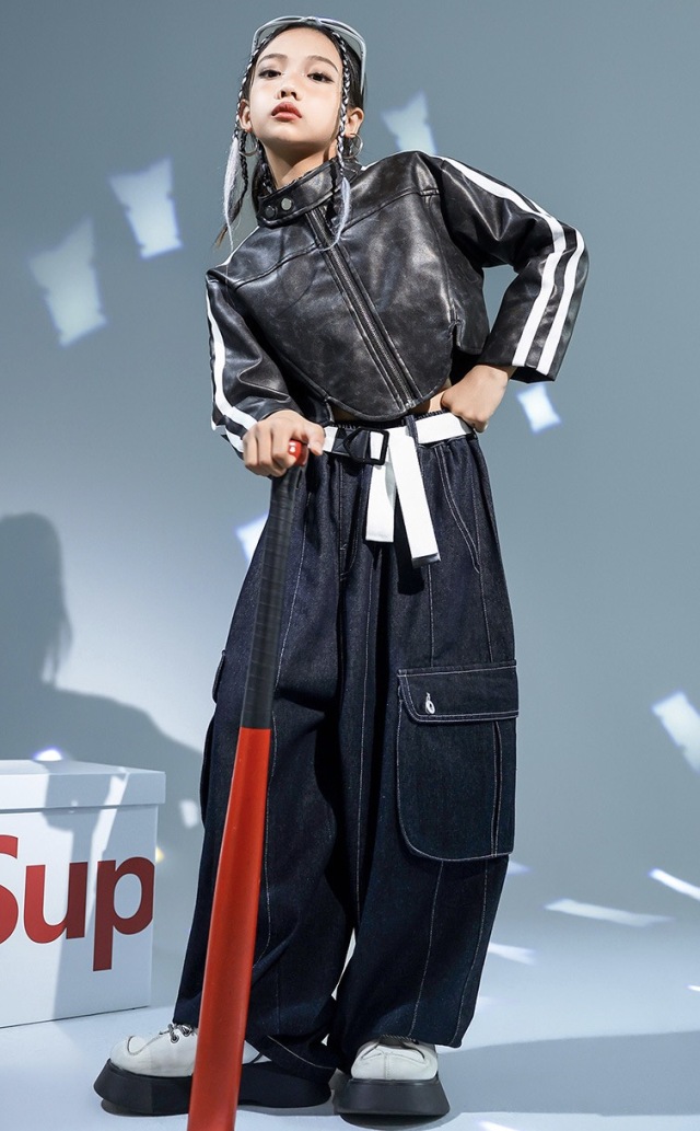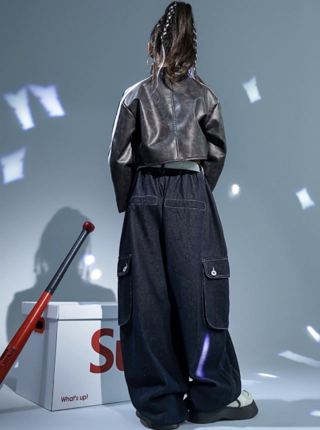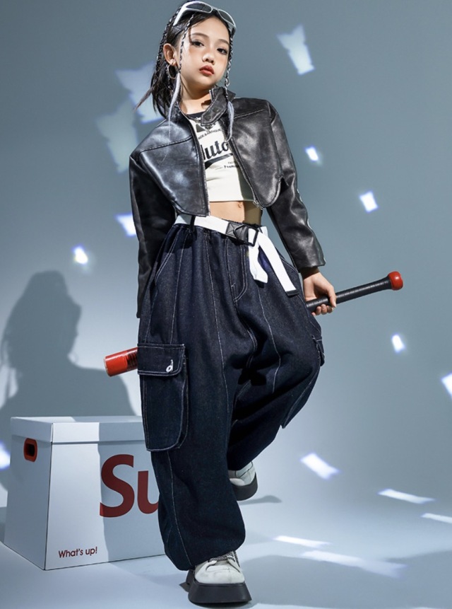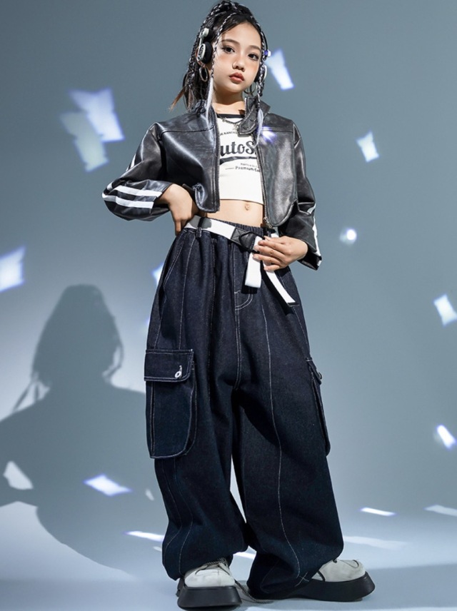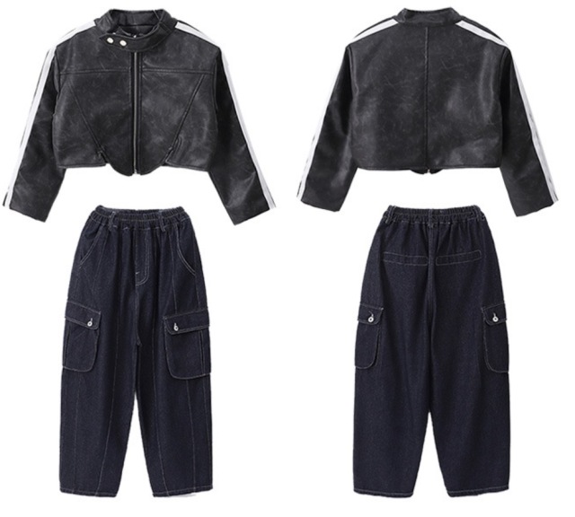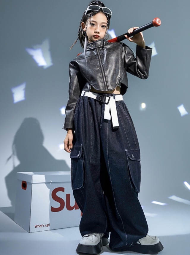 キッズダンス衣装 ジャケット ショート丈 セットアップ トップス デニムパンツ カーゴパンツ ブラック 長袖 ヒップホップ hiphop kpop 韓国 子供 キッズ ダンス衣装 女の子 男の子