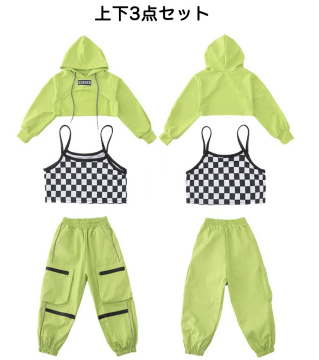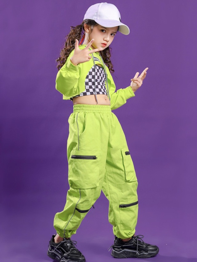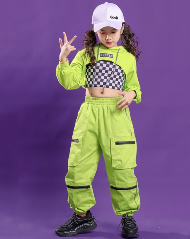 キッズダンス衣装 ガールズ セットアップ カーゴパンツ グリーン ヘソ出し ヒップホップ hiphop kpop 韓国 子供 キッズ ダンス衣装 女の子