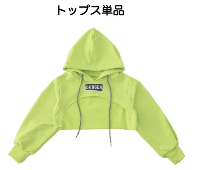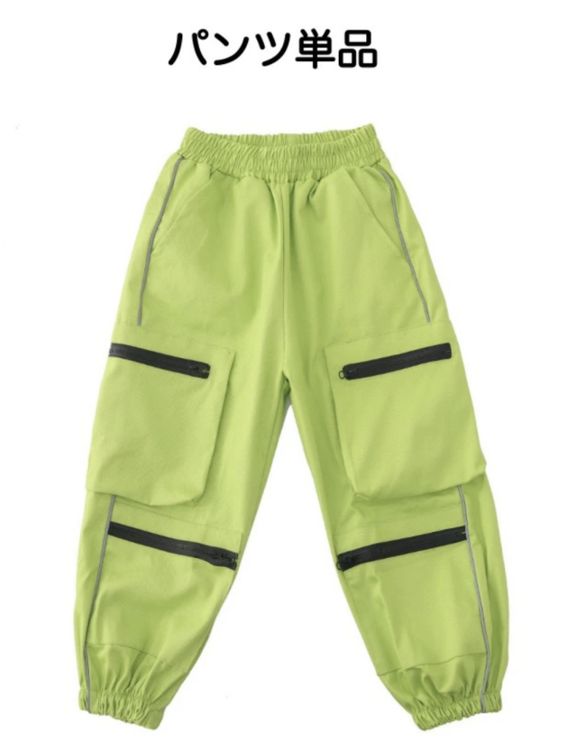 グリーンのガールズセットアップで、ヘソ出しショート丈トップスとカーゴパンツの3点セットアップ、トップス単品、パンツ単品から選べます。110cmから180cmまでの幅広いサイズ展開で、緑色の女の子向けデザイン。ショート丈トップスとカーゴパンツの組み合わせがかっこよく、ヒップホップダンスや韓国ストリートファッションとして人気。ダンスレッスンから普段着まで活躍します。