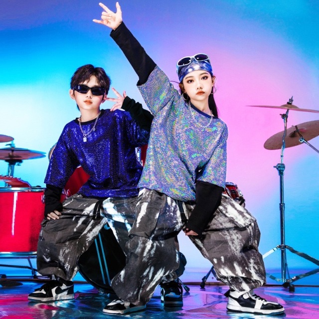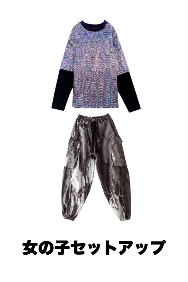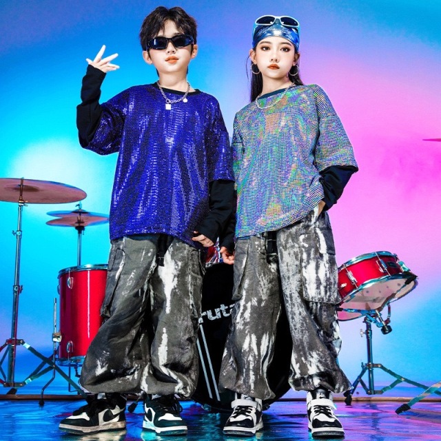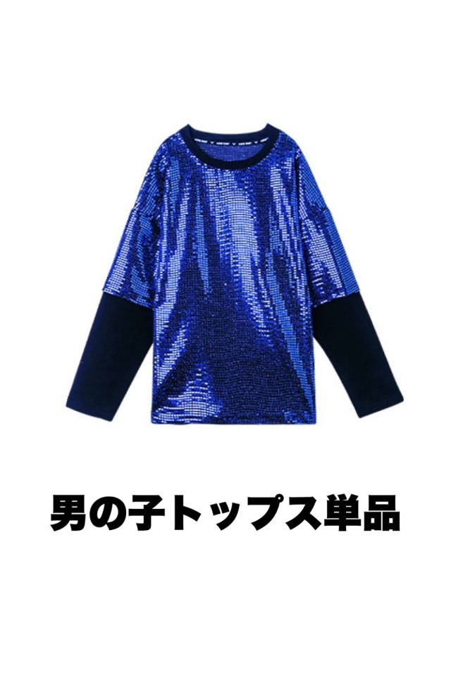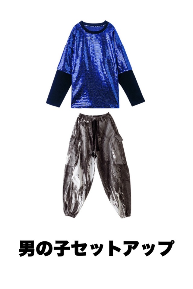 キッズダンス衣装 セットアップ トップス パンツ シルバー 長袖 ブルー 青 キラキラ スパンコール ヒップホップ ガールズ hiphop kpop 韓国 子供 キッズ ダンス衣装 女の子 男の子