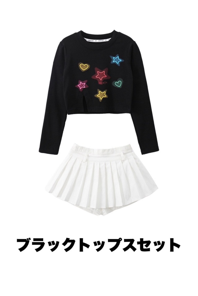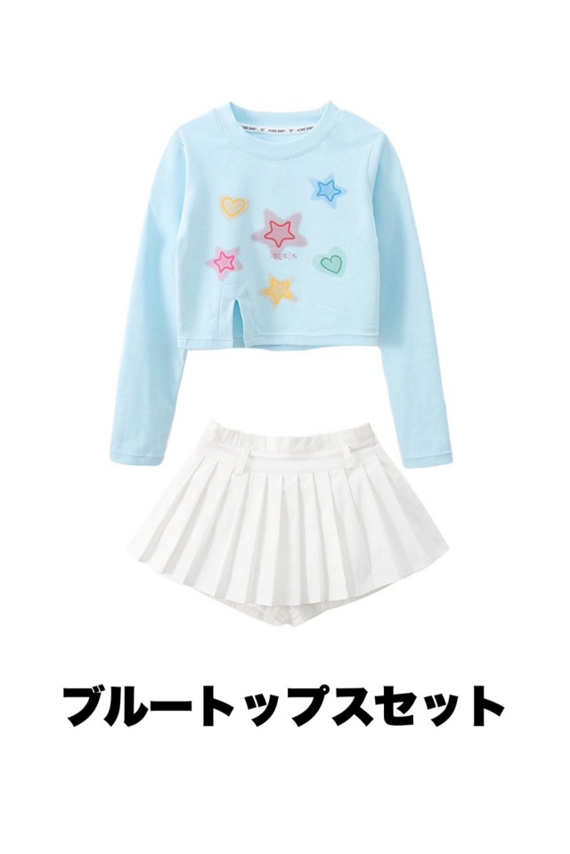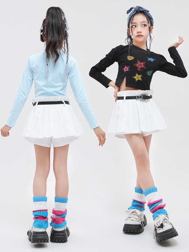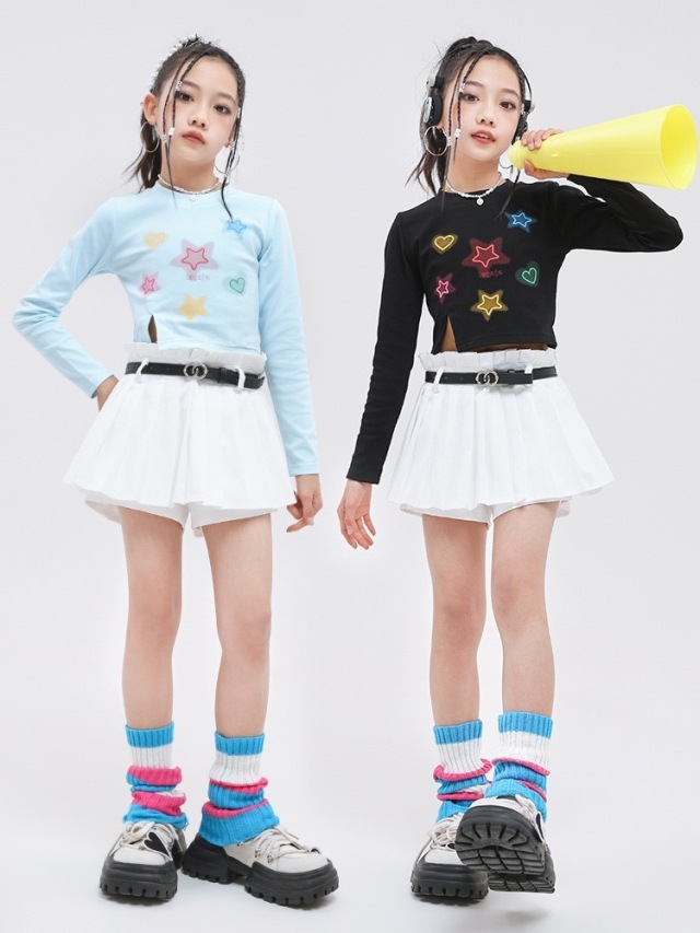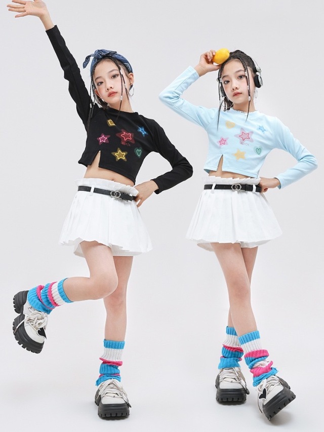 キッズダンス衣装 セットアップ トップス スカートホワイト ブラック ライトブルー 星 スター クロップトップ クロップド丈 ヒップホップ ガールズ hiphop kpop 韓国 子供 キッズ ダンス衣装 女の子 男の子