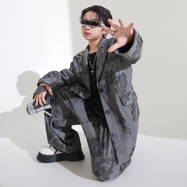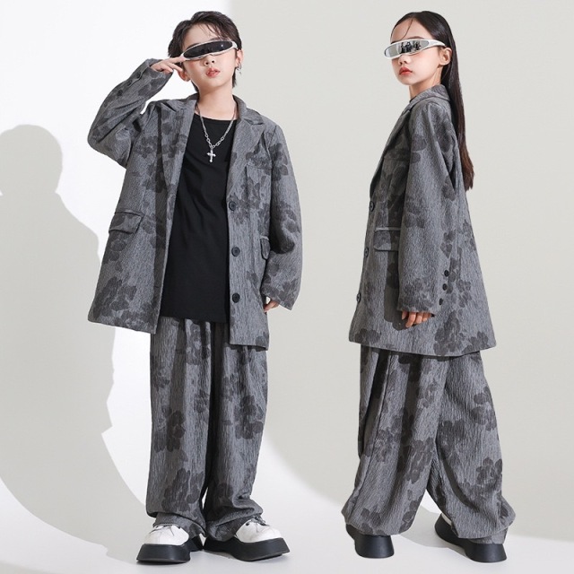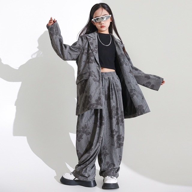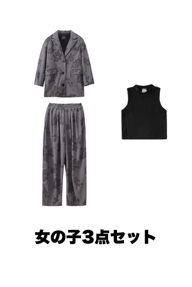 キッズダンス衣装 ノースリーブ ジャケット グレー ブラック タンクトップ クロップトップ セットアップ トップス パンツ ヒップホップ hiphop kpop 韓国 子供 キッズ ダンス衣装 女の子 男の子