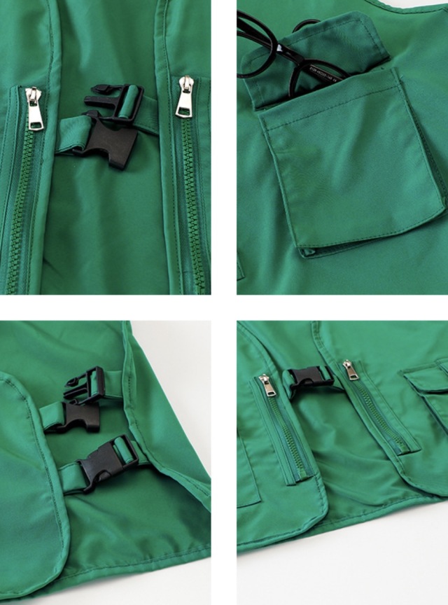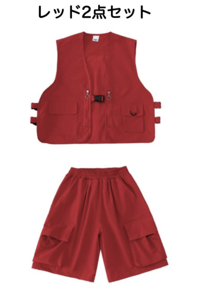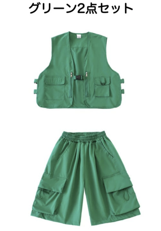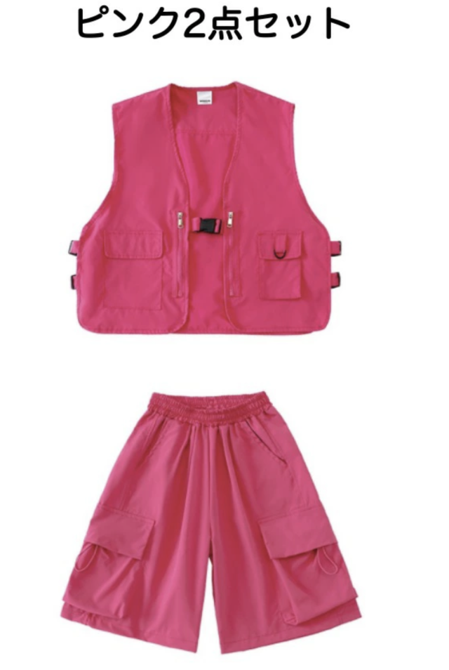 ピンク、グリーン、レッドのベストとカーゴパンツのセットアップで、レッド2点セット、グリーン2点セット、ピンク2点セット、各色ベスト単品、各色パンツ単品から選べます。110cmから180cmまでの幅広いサイズ展開で、赤、緑、ピンクの3色展開。ガールズ向けベストデザインがかっこよく、ヒップホップダンスやK-POP風ストリートとして人気。ダンスレッスンから普段着まで活躍します。
