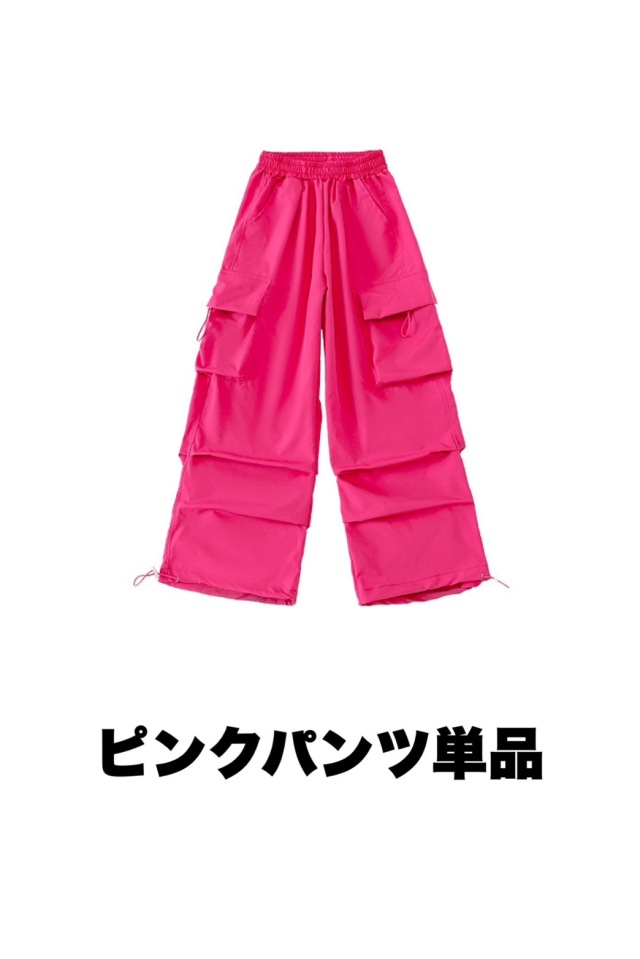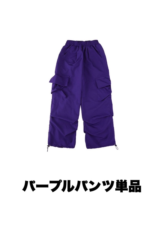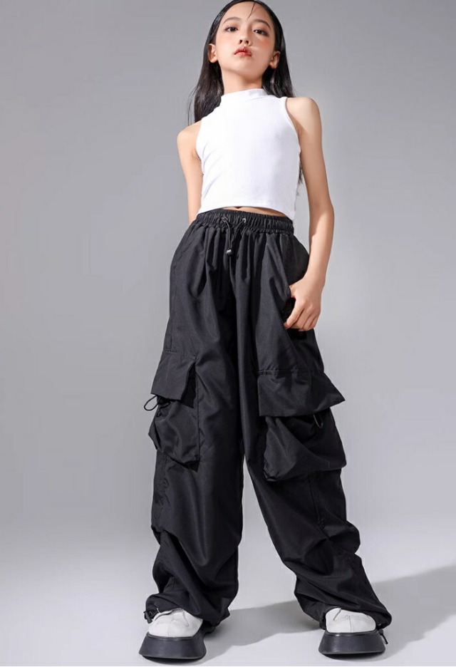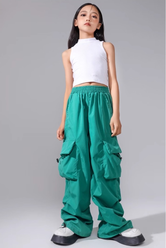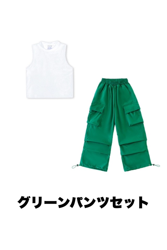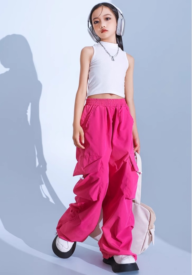 クロップトップ+カーゴパンツのキッズダンスセットアップ。ノースリーブのクロップトップスとカーゴパンツがセットになった機能的なデザイン。ホワイト・ブラック・ピンク・グリーン・パープルの豊富な5色展開で個性に合わせて選択可能。特にガールズダンサーに人気で、ヒップホップ・K-POPダンスに最適なスタイリング。8サイズ対応で女の子の成長に合わせて長く着用でき、韓国風のトレンディなデザインが魅力の衣装セットです。