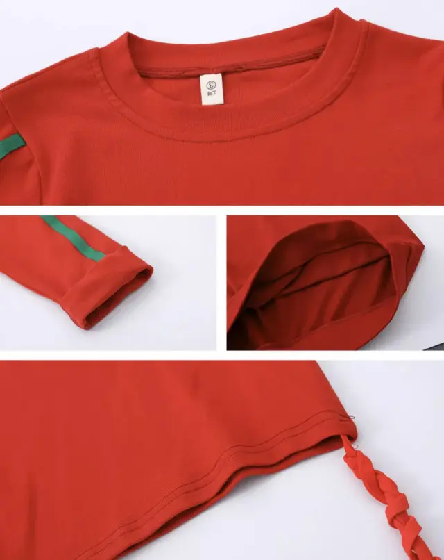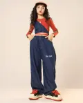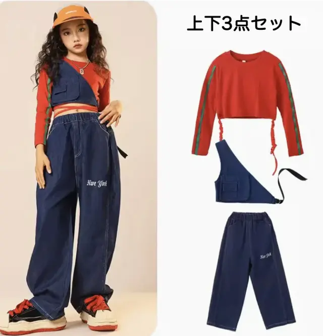 レッドのデニムセットアップで、トップスとパンツの上下3点セット。110cmから180cmまでの幅広いサイズ展開で、赤色のガールズ向けデザイン。デニム素材のトップスとパンツの組み合わせがかわいらしく、女の子向けの衣装として人気。ヒップホップダンスや都会的なストリートスタイルとして、ダンスレッスンから普段着まで幅広く活躍するアイテムです。