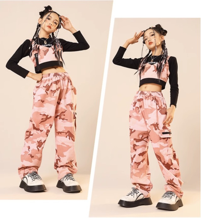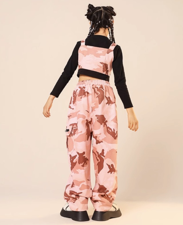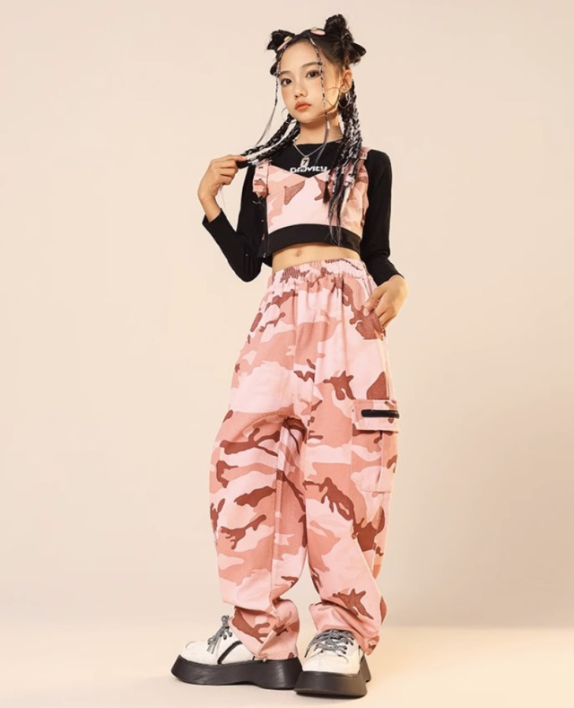 キッズダンス衣装 セットアップ トップス ピンク デニム 迷彩 パンツ ガールズ ヒップホップ hiphop kpop 韓国 子供 キッズ ダンス衣装 女の子