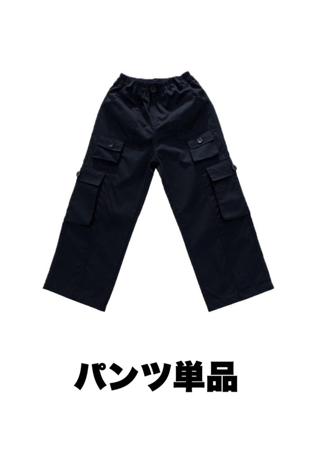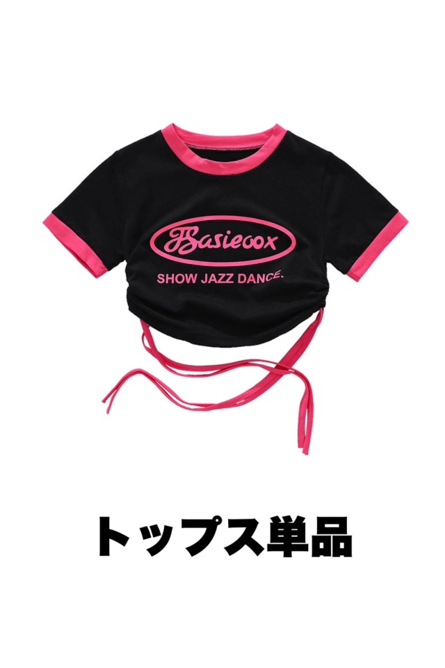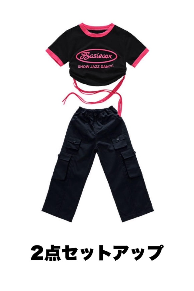 ブラックのクロップトップTシャツとピンクのカーゴパンツのセットアップで、2点セットアップ、トップス単品、パンツ単品から選べます。110cmから170cmまでのサイズ展開で、黒とピンクの組み合わせ。ゆったりダボダボシルエットがかっこよく、ヒップホップダンスや最新トレンドのストリートファッションとして人気。ダンスレッスンから普段着まで幅広く活躍するアイテムです。