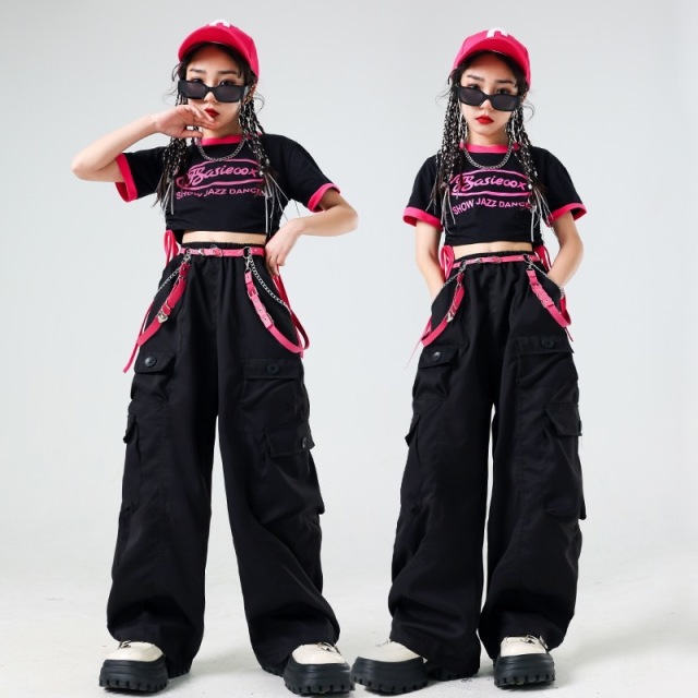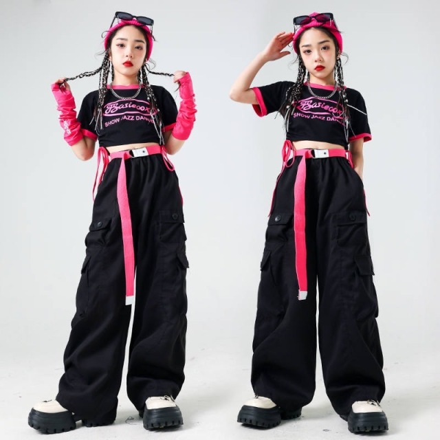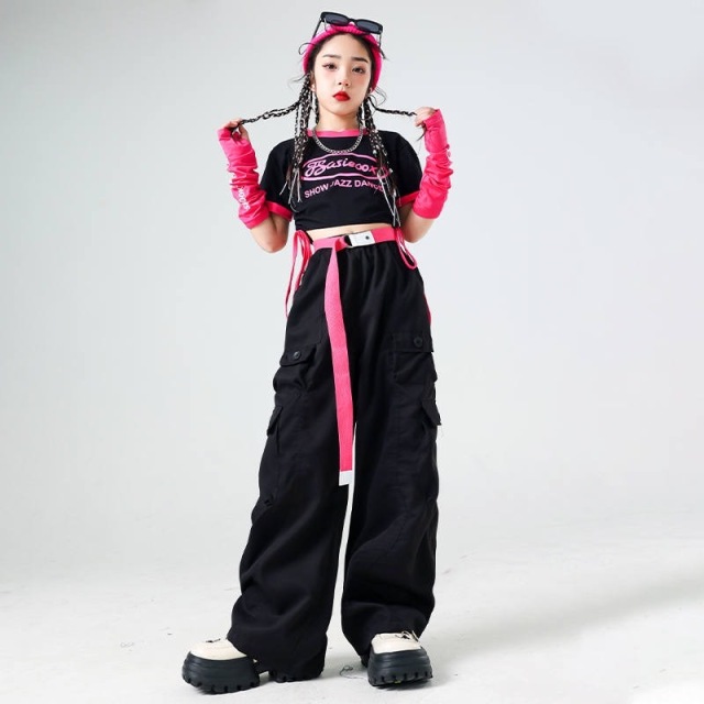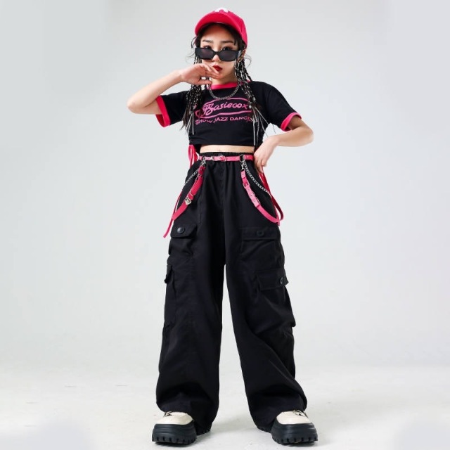 キッズダンス衣装 セットアップ ブラック クロップトップ Tシャツ ピンク カーゴパンツ ゆったり ダボっヒップホップ hiphop kpop 韓国 子供 キッズ ダンス衣装 女の子 男の子