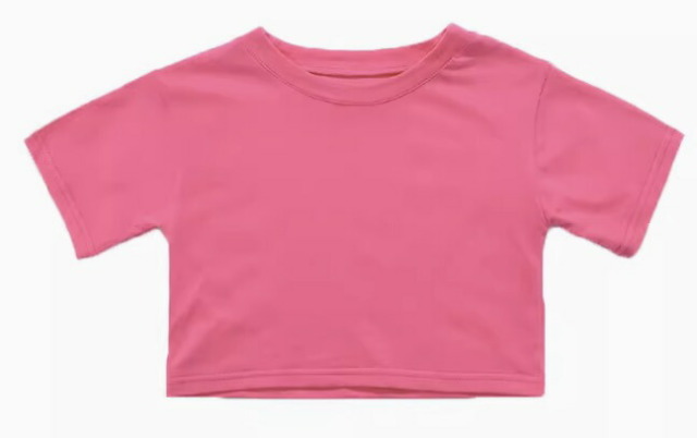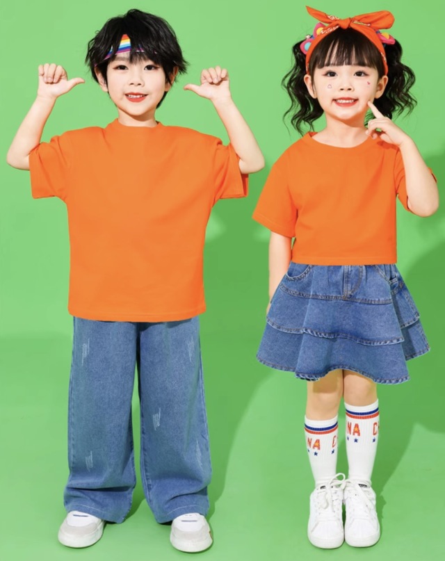 ホワイト、オレンジ、ピンク、イエロー、パープルの半袖Tシャツで、通常丈とヘソ出しショート丈の9タイプから選べます。110cmから170cmまでのサイズ展開で、白、オレンジ、ピンク、黄色、紫の5色展開。男女兼用のガールズ向けトップスで、ヒップホップダンスやスタイリッシュなストリートファッションとして人気。ダンスレッスンから普段着まで幅広く活躍します。