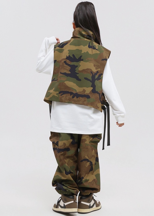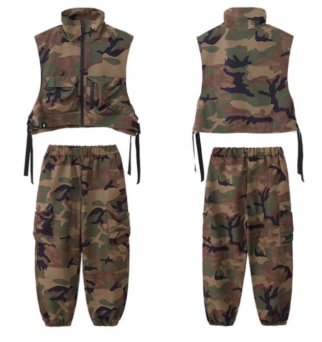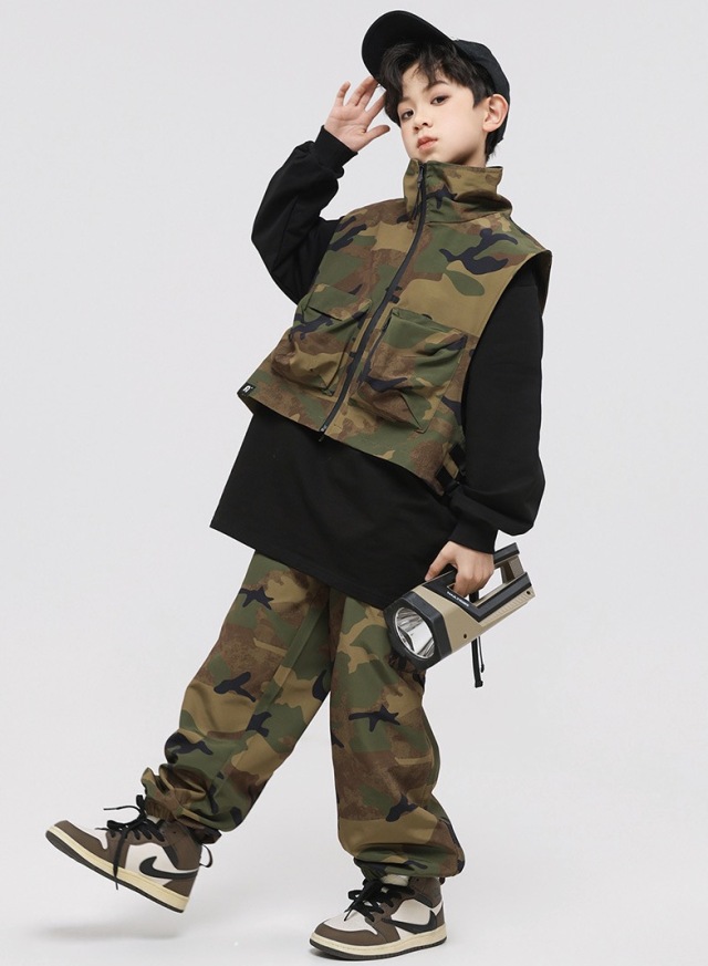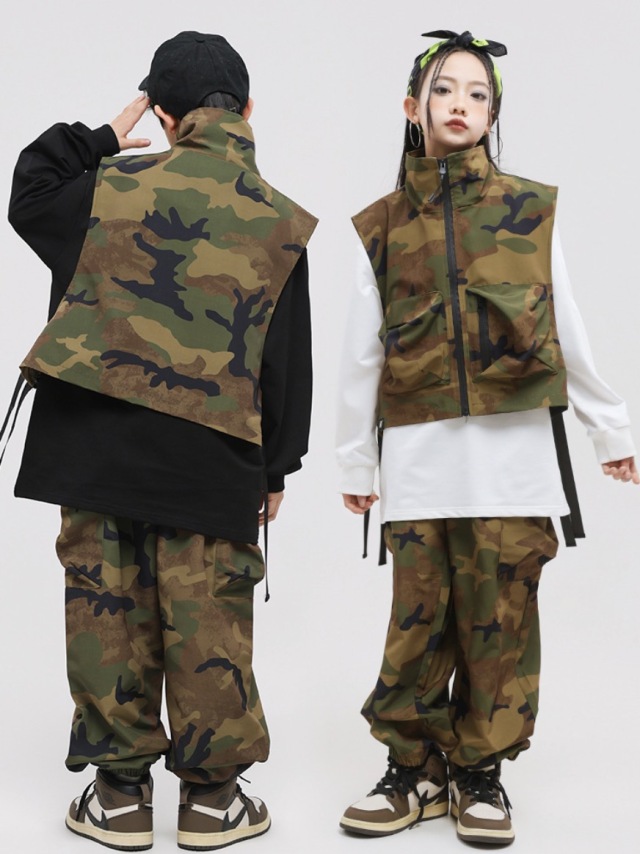 キッズダンス衣装 迷彩 セットアップ ベスト トップス パンツ カモフラージュ カーゴパンツ ゆったり ダボっヒップホップ hiphop kpop 韓国 子供 キッズ ダンス衣装 女の子 男の子