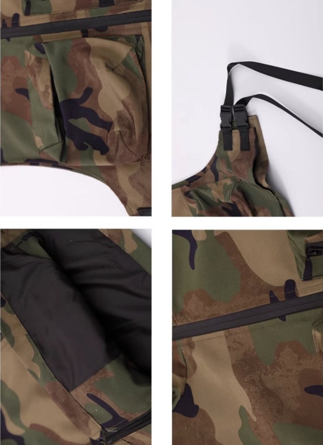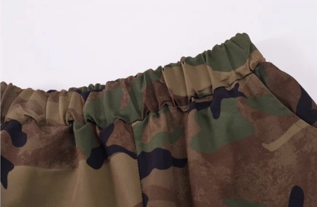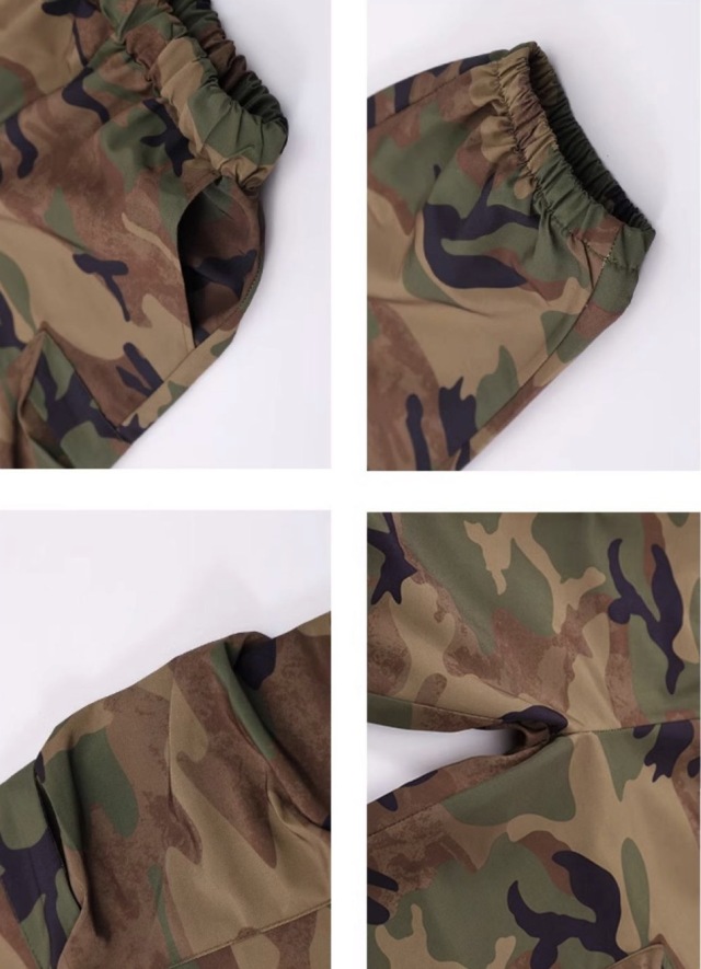 迷彩柄のベストとカーゴパンツのセットアップで、2点セットアップ、トップス単品、パンツ単品から選べます。110cmから180cmまでの幅広いサイズ展開で、カモフラージュデザイン。男女兼用のミリタリースタイルで、ゆったりダボダボシルエットがかっこよく、ヒップホップダンスや流行のストリートファッションとして人気。ダンスレッスンから普段着まで幅広く活躍するアイテムです。