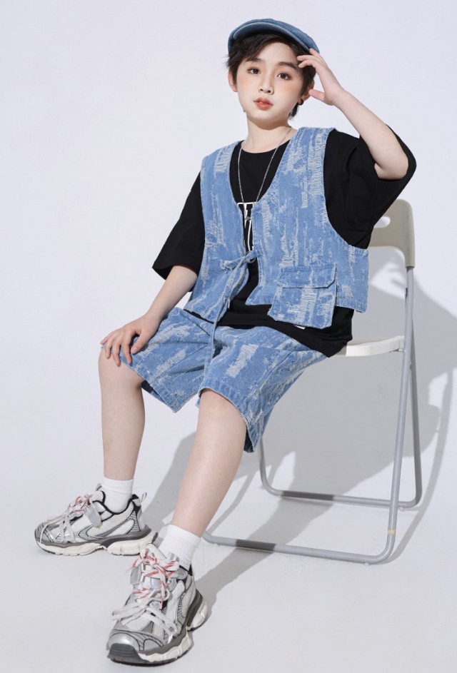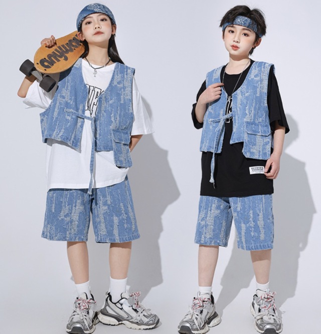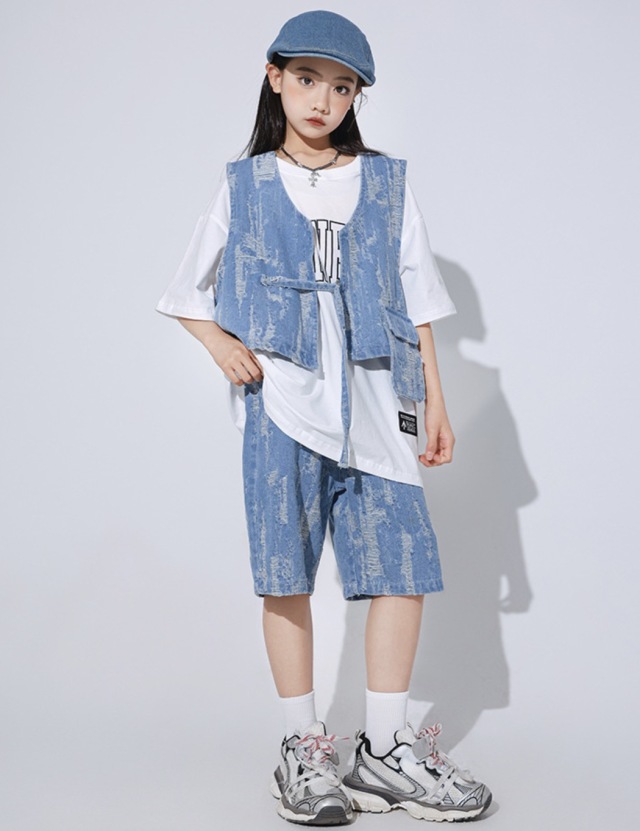 キッズダンス衣装 デニム ベスト ハーフパンツ tシャツ セットアップ トップス ホワイト ブラック ヒップホップ ガールズ hiphop kpop 韓国 子供 キッズ ダンス衣装 女の子 男の子
