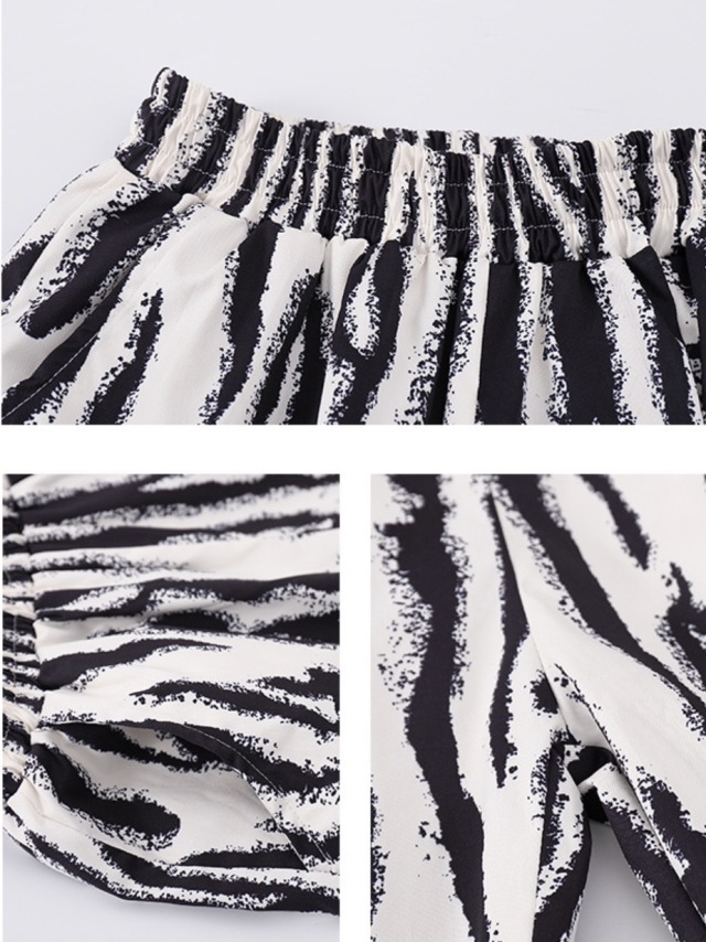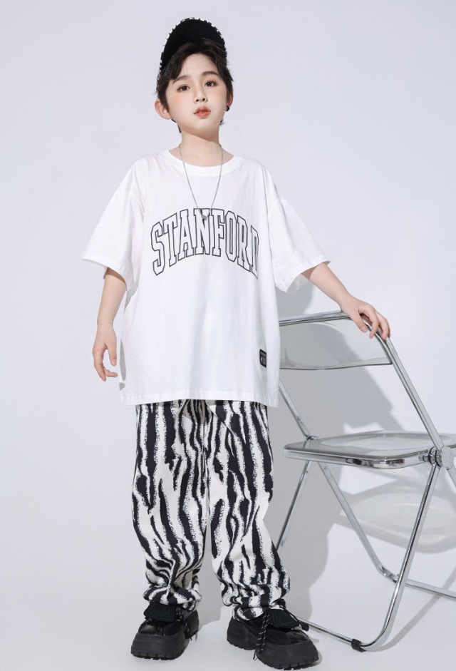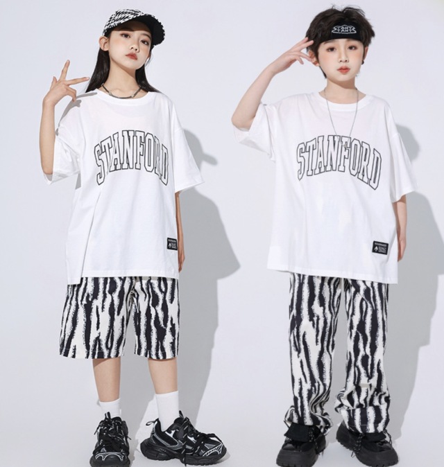 ホワイトとブラックのTシャツで、ゼブラ柄などアニマル柄が個性的。半袖のトップスとハーフパンツまたはロングパンツから選べます。白シャツ、黒シャツ、ハーフパンツ、ロングパンツの単品購入が可能でコーディネートの幅が広がります。110cmから180cmまでの幅広いサイズ展開で、男女兼用デザイン。ヒップホップダンスや韓国ファッションとして人気で、レッスンから普段着まで活躍します。