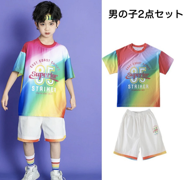 カラフルなレインボー柄が目を引くキッズダンスTシャツとボトムスのセットです。男の子2点セット、女の子2点セット、単品の3タイプから選べます。サイズは110-180cmまで展開。ホワイトベースに鮮やかなレインボーデザインが特徴的で、ヒップホップダンスやK-POP風ストリートスタイルに最適です。発表会や練習着としても活躍します。