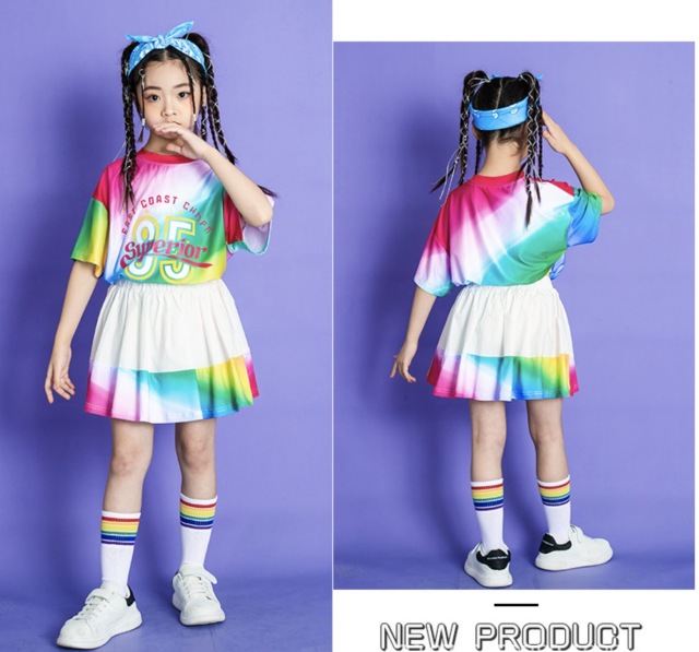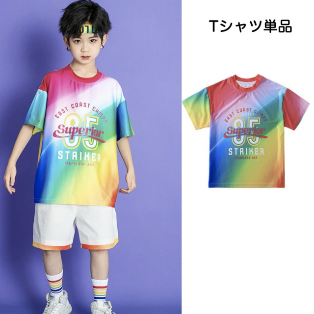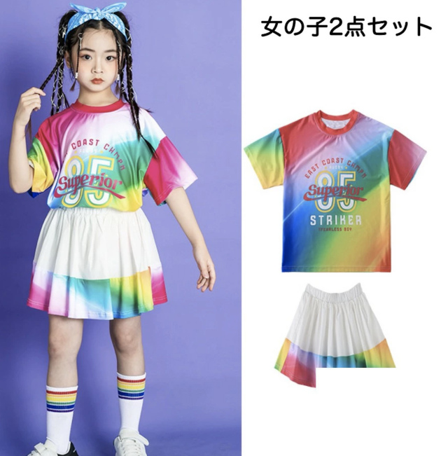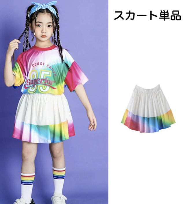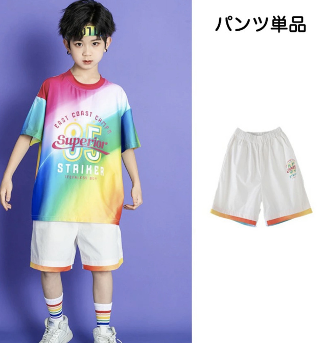 キッズダンス衣装 Tシャツ ハーフパンツ スカート 半袖 カラフル レインボー トップス ホワイト ヒップホップ ガールズ hiphop kpop 韓国 子供 キッズ ダンス衣装 女の子 男の子