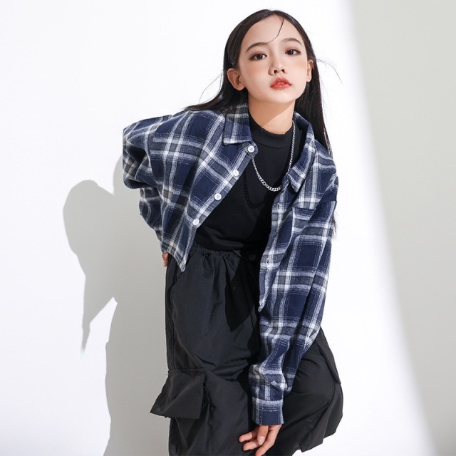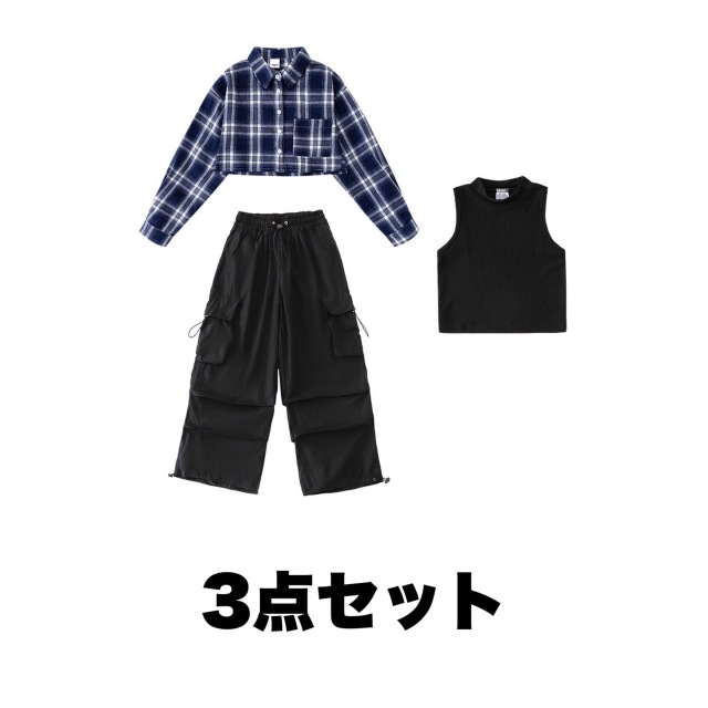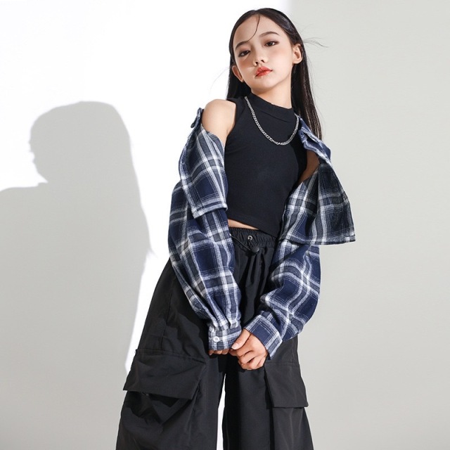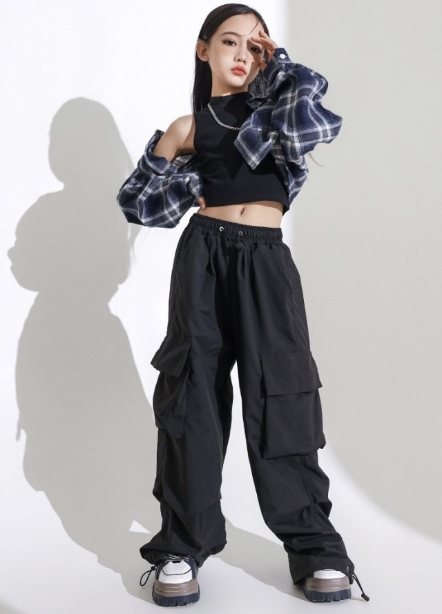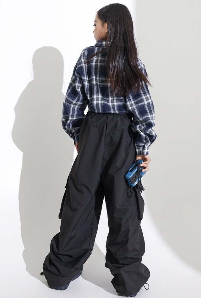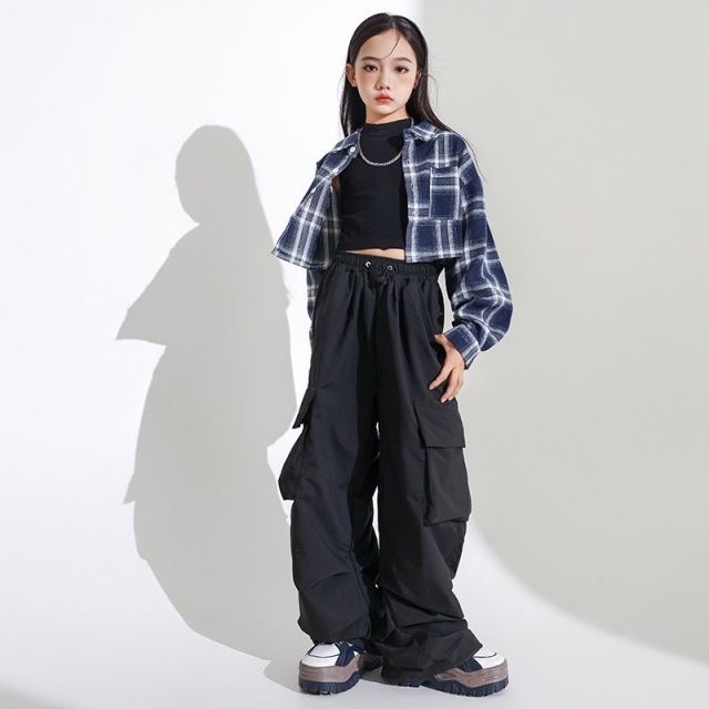 チェック柄のヘソ出しシャツとカーゴパンツのセットアップ。ショート丈のクロップドトップスがガールズに人気です。3点セット、2点セット、トップス単品、パンツ単品から選べる柔軟性が魅力。110cmから180cmまでの豊富なサイズ展開で、ヒップホップダンスや韓国ストリートファッションとして活躍。かっこいいデザインでダンスレッスンから普段着まで幅広く使えるアイテムです。