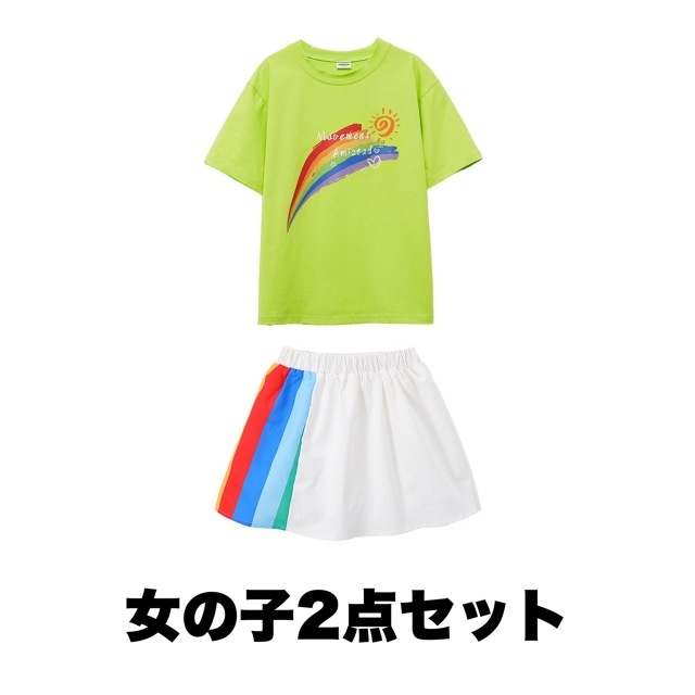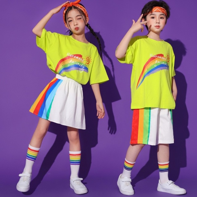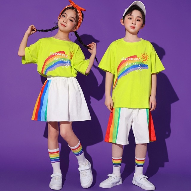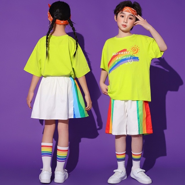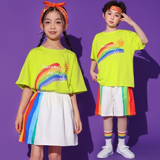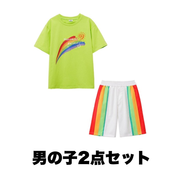 男の子2点セット、女の子2点セット、トップス単品、パンツ単品、スカート単品から選べる豊富なバリエーションのキッズダンス衣装です。ストリートスタイルのかっこいいデザインで、ヒップホップダンスや韓国kpopファッションに最適。練習着から発表会まで幅広く対応できる万能アイテムです。